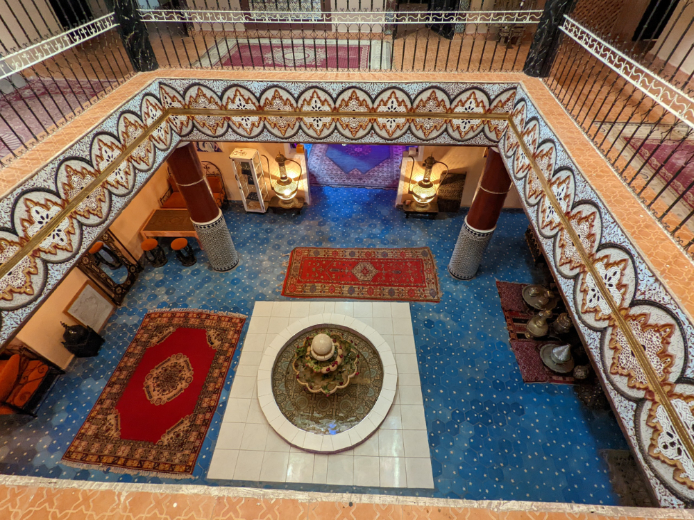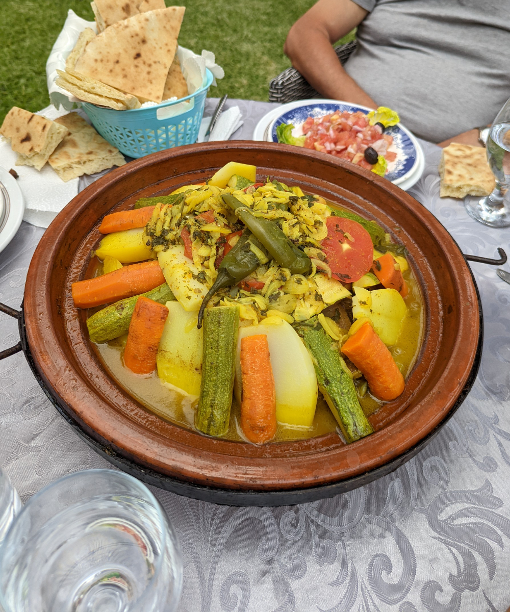 A malincuore, verso le 18:30 ci avviamo all’albergo per una doccia e per la cena e, dovendo anche fare la lampada, è meglio non tardare. Dormiamo in un albergo immerso nel verde e che era, stranamente, barricato dietro un portone di legno in cui non compariva nessuna insegna. Il nostro albergatore ci aveva promesso il solito tajin che, però, assume un aspetto piuttosto maestoso, se fatto per quattro in una padella di terracotta larga circa 40 cm.