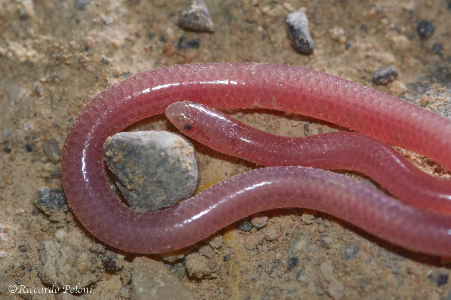 In più, abbiamo la fortuna di vedere un rettile molto raro e schivo. Subito, quando lo vedo, penso a un nematomorfo, ma avvicinandomi mi rendo subito conto che ha le squame e gli occhi. Si rivela essere un Myriopholis, rarissimo serpente tipico delle zone desertiche.