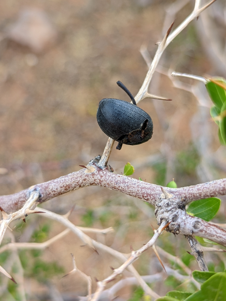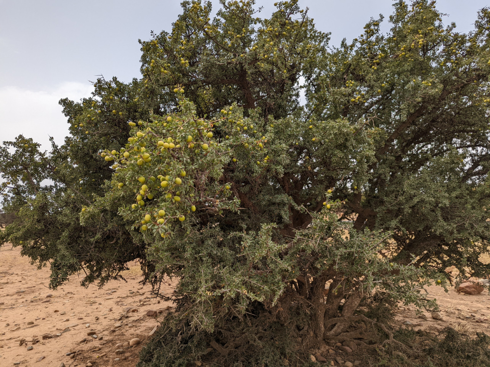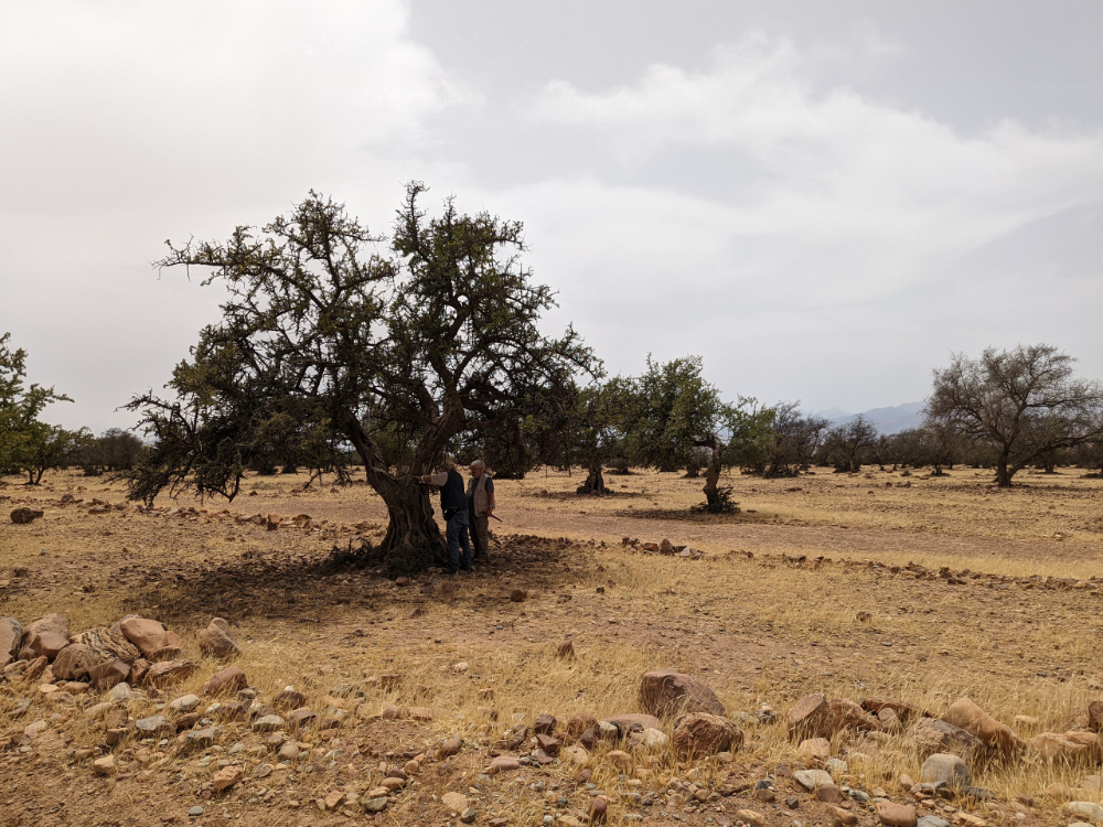 Dopo un paio d'ore giungiamo nella "zona degli arganieti", dove tutto il paesaggio è dominato dalle Argania spinosa, strane piante che crescono nella regione di Agadir, con grossi tronchi nodosi, robuste spine lignee e piccole foglie coriacee, dai cui frutti viene ricavato il prezioso olio di argan, molto utilizzato per la produzione di cosmetici ma anche in cucina. Sui rami apicali di questa pianta vive un interessante Cerambycidae, la Bolivarita oculata, che è la nostra mira del giorno. Il paesaggio è davvero particolare.