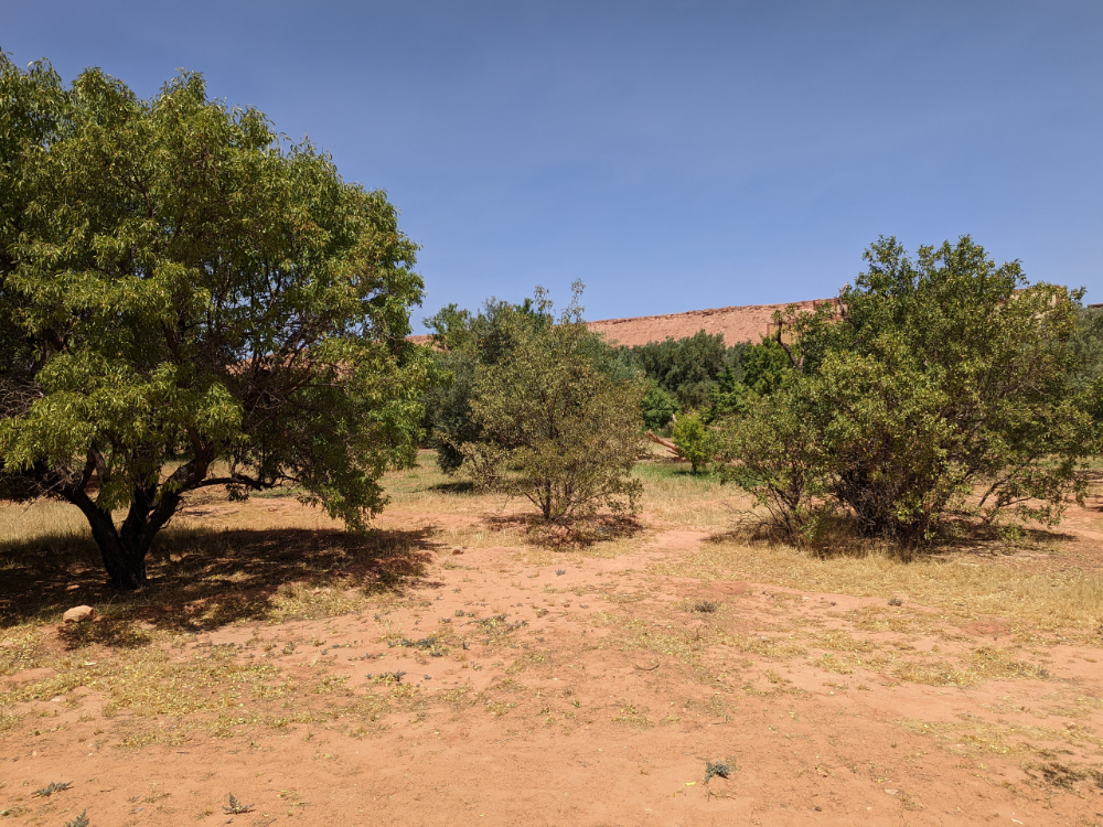 Partiamo abbastanza presto quindi e, dopo circa due ore, decidiamo di fare sosta in un’oasi vicina a Imider, dove alcune piante di mandorlo malandate attirano la nostra attenzione. Come quasi tutte le oasi è coltivata e le piante sono alberi da frutto: oltre ai mandorli si distinguono delle palme, dei fichi e quelli che sembrano gelsi ma con foglie più piccole rispetto ai nostri.