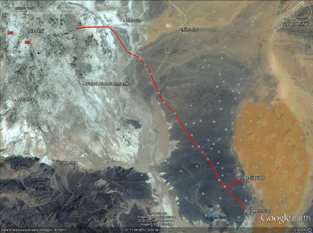 Settimo giorno (03/06/2012)Tracciato settimo giorno Al mattino, dopo un’abbondante colazione, vado a fare un giro verso nord e mi fermo dove vedo il letto asciutto di un fiume, con vari cespugli. Mi metto a cercare ma non trovo assolutamente niente. Il letto del fiume è talmente secco da aver formato una crosta tutta “crepata” di argilla. Mentre camminavo su queste “placche” ho visto qualcosa muoversi e saltellare; guardo meglio e mi accorgo che c’erano moltissime piccole ranocchiette. Si vede che sotto quella crosta c’era comunque dell’umidità. Rientro verso l’hotel e trovo una quindicina di motociclisti austriaci che si erano fermati con le loro moto per trascorrere un pomeriggio nella piscina dell’hotel. Pista che dalla strada N13 porta all'hotel Facciata dell'hotel Mi incammino verso il pozzo trovato la notte precedente; porto con me il retino da sfalcio e strada facendo trovo un palo lungo un paio di metri al quale lego il manico del retino da sfalcio e così riesco a calare il retino nel pozzo e pescare alcuni tenebrionidi dal fondo. Dopo un paio di pescate gli altri insetti presenti si sono rintanati negli anfratti interni per cui desisto – per il momento – e nascondo il retino nelle palme adiacenti così da ritornarci la sera. Foto del pozzo, presa con telefonino Rientro in hotel e mi stendo un po’ a letto accendendo l’aria condizionata, perché era una caldo bestiale. Più tardi vado a cena e in attesa che fosse pronto un ragazzo che lavorava all’hotel mi invita per dopo a prendere un thè con lui e suo fratello. Un po’ mi scocciava perché era mia intenzione di andare subito a caccia, ma ho accettato comunque l’invito e infatti dopo cena siamo stati un’oretta buona a sorseggiare un thè alla menta e a fare quattro chiacchiere. Poi, scusandomi, ho cominciato a cacciare, cominciando dal terrazzo in cui eravamo perché alle luci erano arrivati molti piccoli scarabeidi, dopo di che mi sono avviato verso il deserto, raccogliendo molti tenebrionidi ed i soliti carabidi neri e bianchi. Ho visto anche quattro solifughi ma non sono riuscito neanche a pensare di prenderli perché così come li avevo visti apparire, altrettanto velocemente sono spariti (sono velocissimi). Sono tornato al pozzo ed ho pescato altri tenebrionidi ed i carabidi presenti. Verso le 2.00 sono andato a dormire. ..... segue .....