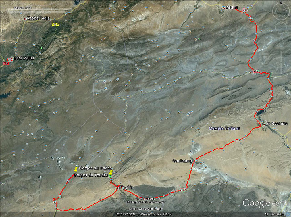 Nono giorno (05/06/2012)Tracciato nono giorno Il mattino, a colazione, conosco due ragazzi di Genova che sono stati in quell’hotel una settimana per fare arrampicate sulle rocce delle gole, e sono in partenza anche loro (ma per tornare in Italia). Dopo colazione carico i bagagli in macchina ed il titolare dell’hotel, sapendo che sarei andato a fare un giro alle Gole del Dadés dopo di che sarei tornato indietro per passare da Er- Rachidia e proseguire verso nord, mi ha invitato a pranzare (gratis) da loro, se al ritorno mi fossi fermato nuovamente lì; ringraziando ho ovviamente declinato l’invito perché la cosa avrebbe voluto dire perdere almeno almeno 3 o 4 ore, e la strada da fare era tanta. Mi ha quindi chiesto se potevo accompagnare un suo amico fino a Tineghir e, ovviamente, ho accettato (ero di strada). Durante i 12-13 km tra le gole e Tineghir questo signore (purtroppo non ricordo un solo nome di tutti quelli che ho conosciuto perché mi risultano complicati, sia da pronunciare che da ricordare) mi illustra un po’ la zona, le coltivazioni, qualche cenno di storia, ecc. Insomma, è un piacere ascoltarlo. A Tineghir ci salutiamo e io proseguo verso ovest fino alle Gole. Ad un certo punto, lungo la strada, in mezzo al nulla, c’è una specie di “porta” ai lati della strada che sinceramente io non ho capito a cosa possa servire. Dal momento in cui si lascia la strada N10 e si prende quella per le gole (distanti una trentina di km.) si trovano bei paesaggi ma le gole in sé per sé mi hanno un po’ deluso: strada e piccolo torrentello costeggiati da due pareti a picco di roccia, molto vicine tra loro, lunghe un centinaio di metri (forse qualcosa di più). Boumaine ed Dadés Fiume Dadès Paese lungo la valle del Dadés Valle del Dadés Passate le gole mi fermo in un punto in cui noto alcune piante e provo a dare un’occhiata in giro; trovo un po’ di scarabeidi (comprese due Hoplia molto chiare, quasi bianche) e un po’ di curculionidi. Mentre cercavo mi si avvicina un signore con il figlio (era un po’ che mi guardavano da una tenda lì vicino) e mi chiede incuriosito cosa stessi facendo; gli dico che sto cercando insetti facendo loro vedere quelli che avevo trovato, e a quel punto mi chiede il perché; gli rispondo che li studio e li colleziono (avrà capito?). Fatto sta che poi si allontana e mi dice di stare attento alle spine delle piante sulle quali sto cercando. Riparto e torno indietro sulla N10 per raggiungere Er-Rachidia. Nel tratto tra le due gole (Dadés e Toudra) trovo alcune mandrie (si dirà così?) di dromedari; poco dopo ne trovo uno che “pascola” sul bordo strada. Continuo fino a Er-Rachidia dove prendo la N13 verso Nord, fermandomi in serata poco prima di Midelt perché, per mio puro sfizio, volevo fermarmi a dormire nell’Hotel Kasbah Assmaa; l’avevo visto sulla guida e ci ero passato davanti nel tragitto di andata. Ha una facciata stile Kasbah e immaginavo che dentro fosse molto bello. Ed infatti così è. Faccio una doccia e scendo a cena, poi mi metto a cercare insetti fuori dall’hotel, con la lampadina. Il guardiano del parcheggio dell’hotel, ovviamente incuriosito, mi chiede cosa stessi facendo così glielo spiego e prima mi suggerisce di provare a guardare lungo il muro di cinta dell’hotel (e trovo qualche tenebrionide), poi mi accende tutte le luci del giardino interno all’hotel e mi manda a cercare sulle piante del giardino .. ma qui non trovo assolutamente nulla. Mentre ero all’esterno mi si avvicina il proprietario dell’hotel, anche lui incuriosito da quello che facevo, e gli faccio vedere i pochi insetti che avevo trovato. Mentre chiacchieravamo ci passa vicino un grosso riccio (porcospino) al che mi dice che da loro non sono molto frequenti e vengono mangiati (e considerati una leccornia). ..... segue .....