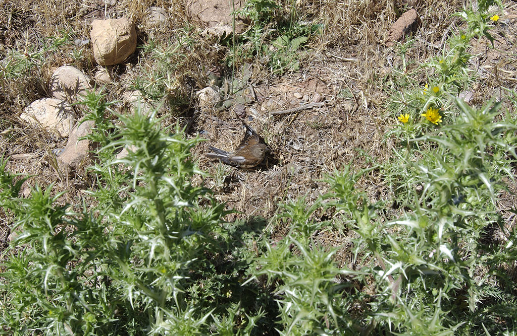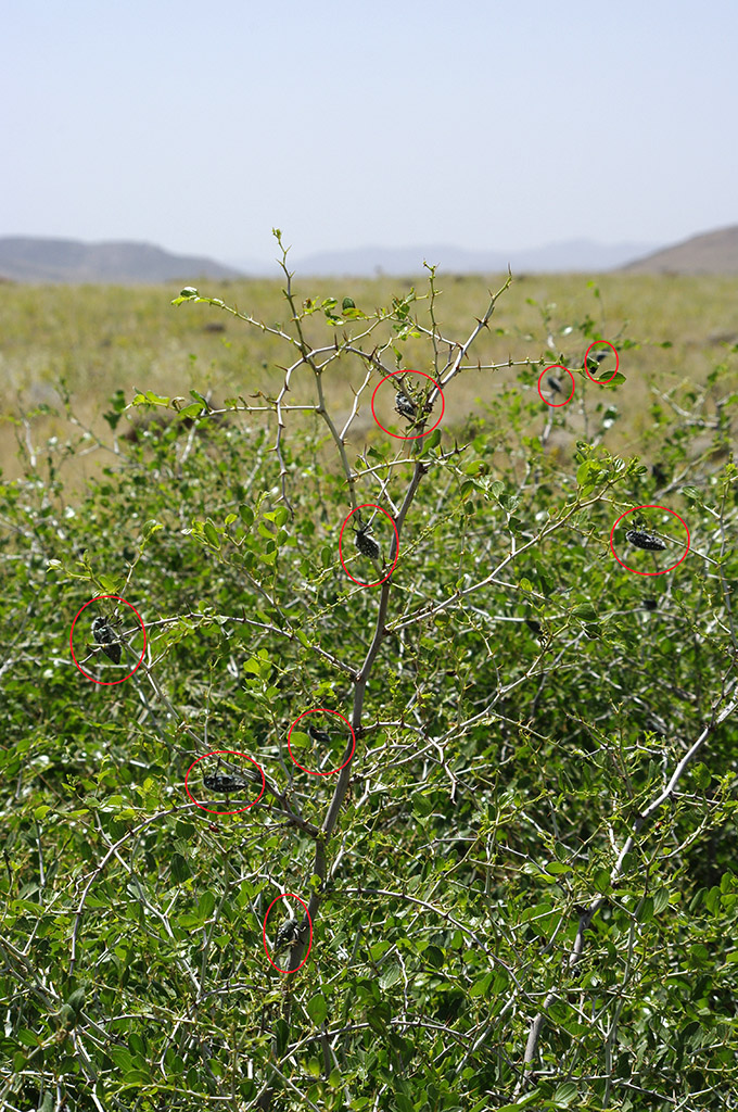 Undicesimo giorno (07/06/2012)Tracciato undicesimo giorno Oggi ho (o, meglio, avrei) intenzione di fare tante cose: cercare lo Julodis manipularis poco distante da Azrou, esplorare meglio la zona di Ain Leuh, tornare nella foresta di cedri a raccogliere ancora un po’ di legna e, infine, ritornare verso lo Jbel Hebri per cercare questo benedetto Dorcadion. Parto in direzione ovest per esplorare una zona dalla quale ero passato la sera prima venendo da Midelt ma, percorsi poco più di 20 km, vedo sulla destra una distesa di grandi ombrellifere bianche, vicino ad un lungo muro a secco che separa la strada da un frutteto, per cui mi fermo e comincio ad esplorare. BINGO! Saltano fuori una sessantina di Cerambycidi (molte Agapanthia, alcune nere a puntini bianchi – che mi pare Maurizio Bollino mi avesse indicato come A.irrorata - altre completamente nere, nonché un’altra Agapanthia piccola, di colore grigiastro-marroncino con banda longitudinale scura, e una piccolissima, tipo Calamobius filum, ma color marroncino …… tutte queste sui fusti delle ombrellifere; sulle infiorescenze, invece, due credo Purpuricenus – erano state postate alcune foto, mi pare da Maurizio “Julodis”, ma erano leggermente differenti dai due che ho trovato, ma forse si tratta di mera variabilità cromatica). Sulle infiorescenze ho raccolto diversi Cetoniini, Glaphyridi, Cleridi, Chrysomelidi e Curculionidi. Finito di esplorare la distesa di ombrellifere, vedo sull’altro lato della strada un cespuglietto piccolo di giuggiolo e vado a dare un’occhiata: ecco gli Julodis manipularis  . Ne raccolgo un po’, unitamente a qualche Chrysomelide. Mentre raccoglievo mi sento chiamare dall’altro lato della strada e vedo due ragazzi che stavano lavorando in un campo a bordo strada, che mi dicono qualche cosa. Non essendo riuscito a capire cosa volessero, ho attraversato la strada avvicinandomi, con la convinzione che mi volessero chiedere cosa stessi facendo; e invece credo che non gliene potesse importare di meno; mi invitavano a prendere un thè con loro nella tenda che avevano lì nel campo. Devo dire che sono rimasto meravigliato di questo ma ringraziandoli infinitamente di cuore, ho declinato l’invito (sinceramente con tutto quel caldo un thè bollente – perché lì in Marocco lo fanno veramente bollente - proprio non mi andava). Dopo poco mi sono spostato di qualche centinaio di metri con l’auto ed ho trovato alcuni cespugli sempre di giuggiolo. Fermo la macchina e vado a vedere. Non credo ai miei occhi: quei cespugli sono letteralmente gremiti di Julodis manipularis; ce ne saranno stati centinaia e centinaia. Questa foto giusto per farvi capire la concentrazione di questi Julodis; praticamente ogni rametto di giuggiolo era messo così, o quasi. Comincio a raccoglierne; in mezzo a questi trovo anche uno J.pilosa; ogni tanto cambio obiettivo: mi metto a cercare in qualche cacca di mucca e trovo un po’ di coprofagi, poi torno agli Julodis, poi vado a cercare sui fiori di cardi, e via discorrendo. Praticamente in questi due posti mi è volata l’intera giornata. Sono comunque andato a fare un giretto prettamente turistico fino ad oltre Ain Leuh. Rientro quindi in hotel e la sera è dedicata interamente a sistemare le valigie e tutte le bottiglie con le catture. Cena, ultimi preparativi, poi a letto. ..... segue .....