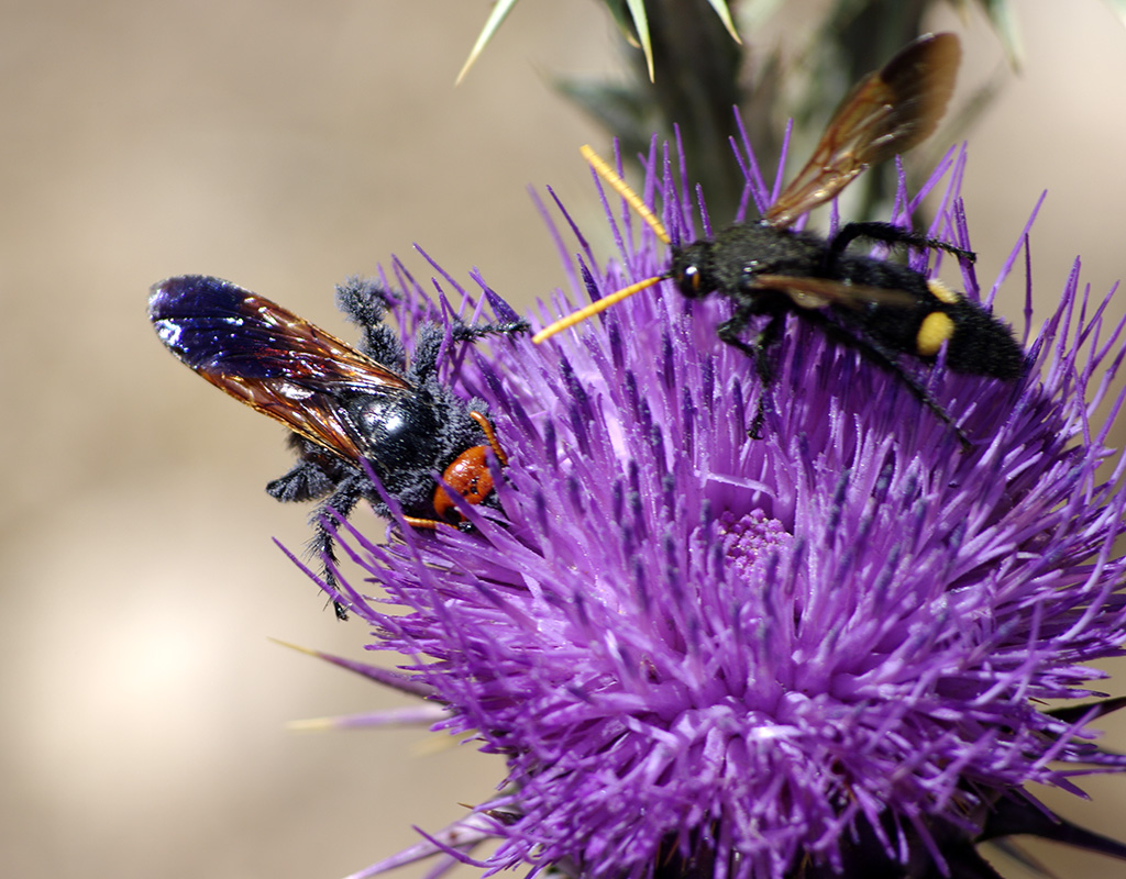 Decimo giorno (06/06/2012)Tracciato decimo giorno Dopo colazione carico i bagagli in macchina e il proprietario dell’hotel mi invita a visitare un suo piccolo museo personale, all’ingresso dell’hotel, pieno zeppo di oggetti, abiti e quant’altro della cultura marocchina (nomade, berbera, ecc.): una meraviglia. Ci salutiamo e riparto, non prima di aver lasciato una mancia al guardiano notturno per l’aiuto datomi la sera prima. In lontananza vedo che una montagna (credo lo Jbel Ayachi) aveva ancora della neve sulla sommità. Arrivato a Zeida svolto verso ovest sulla R503 che percorro fino ad intercettare la N8 e mi dirigo a nord, attraversando Khenifra, fino ad Azrou. Lungo il tragitto mi fermo in quattro punti a cercare insetti. In uno di questi, oltre a vari Meloidi, Scarabeidi, qualche coprofago su sterco di asino, vedo anche un fringillide che saltellava nell’erba ma non volava; avvicinatomi mi sono accorto che da come teneva un’ala doveva averla probabilmente rotta. In un punto semi-desertico, ricordo di aver visto volare dei “fornicaleoni” enormi (almeno per me) ma nonostante avessi il retino da sfalcio (per aiutarmi a prendere qualche Julodis dai cespugli di giuggiolo) non sono riuscito a prenderne neanche uno  . Ogni tanto, su qualche torretta, camino o altro, vedevo qualche cicogna (in quelle zone ne ho viste molte). In altri posti nei quali mi sono fermato ho raccolto Buprestidi (Anthaxia e Acmaeoderella), Chrysomelidi, Meloidi, Mordellidi, Curculionidi, altre due Hoplia quasi bianche, e alcuni Cerambycidi (Stenopterus e una serietta di Clytini). Su un fiore di carduacea ho visto anche due grossi imenotteri – tipo Scolia - che ho provato a fotografare (non stavano mai fermi, e tirava anche vento  ). Arrivato a Azrou verso le 18.30 mi sono ritrovato dentro al traffico “di punta” cittadino: un vero caos.  Stavolta seguo la guida per un altro hotel, leggermente lontano dal centro, ma non mi interessa (volevo appunto evitare la catapecchia provata all’andata). Mi accordo per il prezzo e gli orari di cene e colazioni (due notti) e mi sistemo in camera. Praticamente la prima notte ci sono solo io. Anche qui hanno connessione wi-fi. ..... segue .....