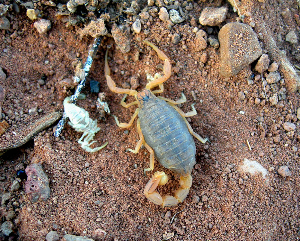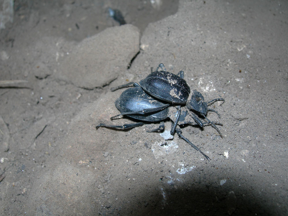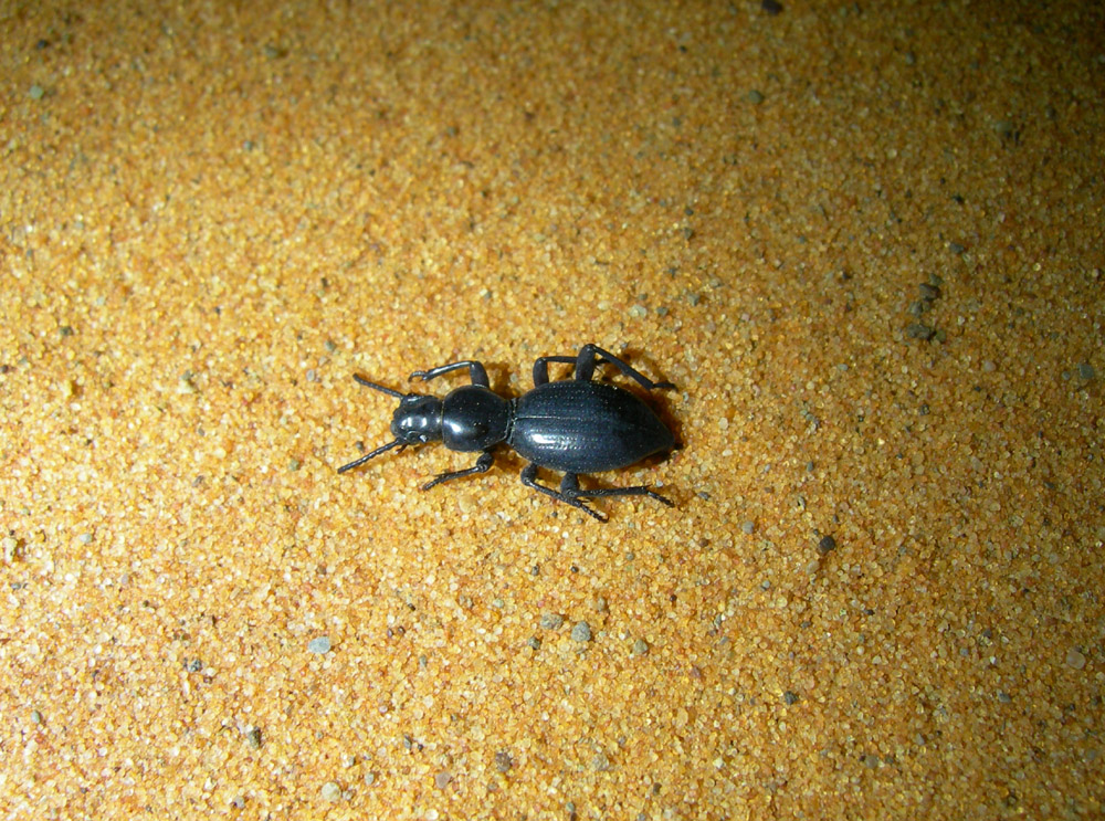 In questo tipo di ambiente il segreto è adattarsi alle esigenze dell'entomofauna che si vuole raccogliere: bisogna uscire di notte! In effetti girando con le lampade frontali, oltre a qualche scarabeoideo ( Phyllognathus, Trox), abbiamo raccolto un gran numero di Tenebrionidi, comprese alcune specie di grande interesse e ancora in parte da studiare (devo ancora metterci mano): Blaps (3 sp.), Pimelia (2 sp.), Trachyderma, Adelostoma, Pachychila, Oterophloeus, Mesostena, Hiontisoma, Akis (2 sp.), Scaurus, Morica, ecc.). Gli esemplari, introvabili di giorno, nottetempo venivano fuori dalle tane dei roditori scavate nel terreno Scaurus sp. (cf. aegyptiacus) Akis reflexa ssp. Pimelia gibba ssp. Blaps sp. Trachyderma hispidum e Akis reflexa ssp. Buthus sp. Grosso solifugo ( Galeodes sp.?) Mancherò per qualche giorno, quindi riprenderò il reportage a metà della prossima settimana  Ciao Piero
