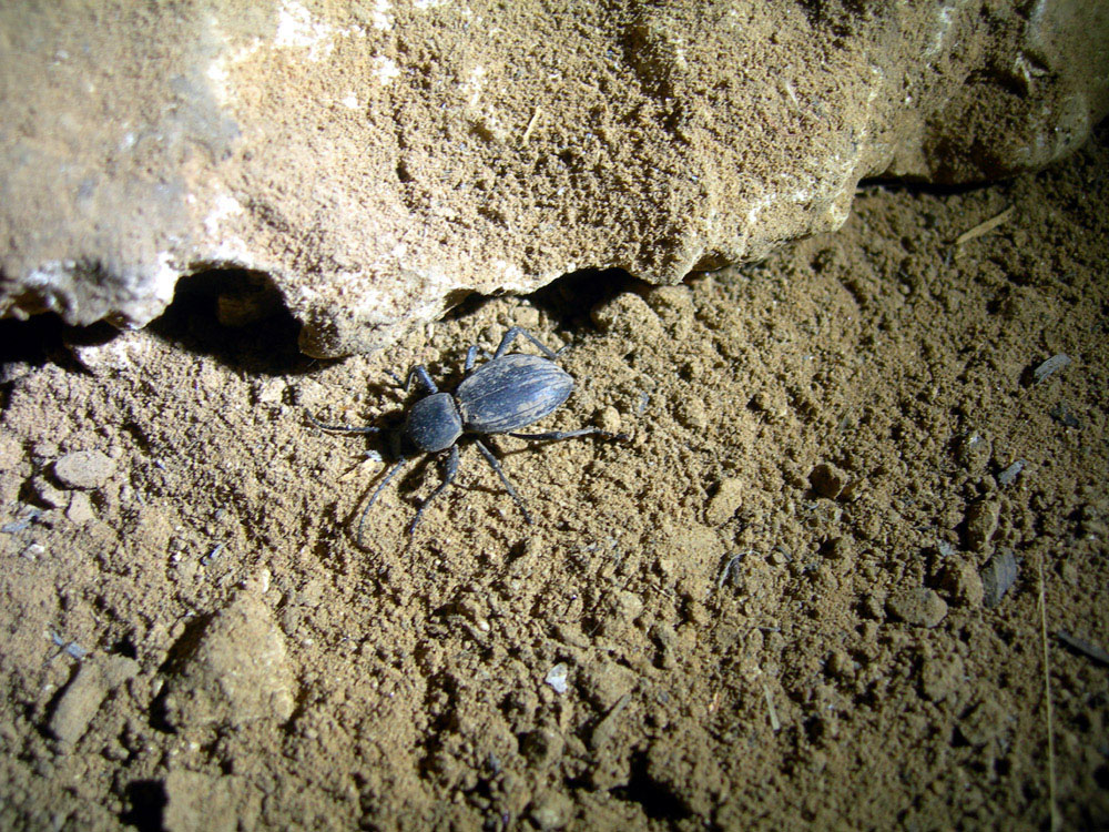 Nella stessa splendida giornata che ci ha fruttato il Musurgus stridens e la Thyreogonia costata riusciamo a portare a termine una piccola missione speleologica che sognavo da molti anni e che avevo cercato di programmare al meglio prima di partire: grotta di Kef Aziza presso il minuscolo villaggio di Tazouguerte (provincia di Errachidia, non lontano da Boudnib) Dopo una bella sudata (sono le tre del pomeriggio e c’è un caldo rabbioso) raggiungiamo l’ingresso della grotta Nella grotta la temperatura è decisamente più mite rispetto al caldo torrido che c’è fuori, anche se continuiamo a sudare per l’umidità e per la frenetica attività di girare tutte le pietre  Eccola finalmente: Akis penoti Antoine, 1957 Questa Akis fu descritta come sottospecie di Akis susica (della costa atlantica del sud del Marocco) e talora confusa con Akis heydeni (dell’Alto Atlante); secondo me (ma devo ancora studiarla in dettaglio) è probabilmente una specie valida ben caratterizzata. Si conosce solo ed esclusivamente di questa grotta, dove probabilmente è rimasta confinata dai cambiamenti climatici e ambientali verificatisi nella regione. Questi sono i primi esemplari che vedo (e anche i primi di cui ho notizia dopo la descrizione basata su due individui). La specie è presente sia nel tratto iniziale della grotta (dove ancora la luce penetra parzialmente), sia più in profondità dove l’oscurità è totale