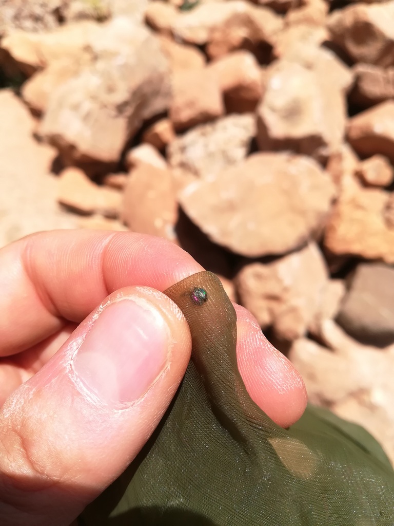 Finché c'è ancora luce raccogliamo un po' di tutto ma prevalentemente tenebrionidi e carabidi sotto pietra. Poi, quando la luce solare inizia davvero a scemare sistemo due trappole luminose distanziate da circa 300 m e costituite da una bassa bacinella interrata e riempita di acqua saponata, sormontata da un piccolo treppiede da fotografia che sostiene un led uv da 10W alimentato da una power bank per telefonia (nella foto seguente non è ancora montato il treppiede con il led. L'adesivo rosso è un catarifrangente adesivo che mi permetterà di individuare la trappola in caso di spegnimento accidentale di notte):