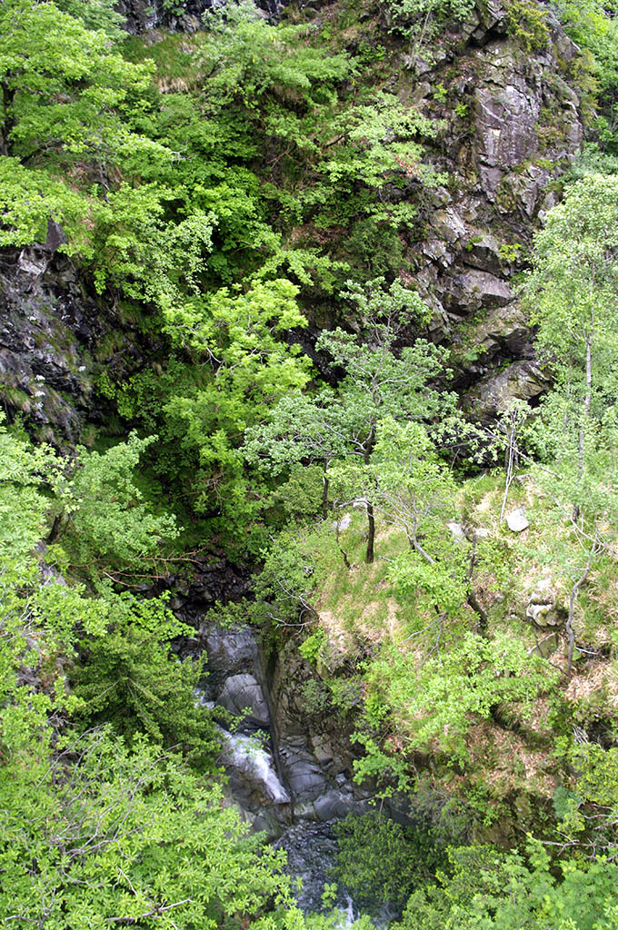 Vista dalla parte medio alta del Canale Teagiolo, verso valle (Introbio) .... in quel punto il sentiero scorre a mezza costa in boschi misti di latifoglie.