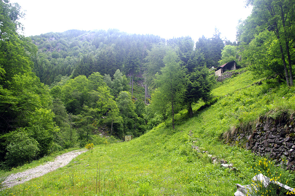 Dopo poche centinaia di metri dal ponte il sentiero si trova al livello del Canale nella località Baite Serra (sullo sfondo la citata "Pineta di Mezzacca")