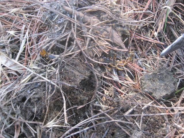 Come volevasi dimostrare, ecco il covo di un grande ragno, un Lycosidae, molto probabilmente Hogna radiata (Latreille, 1817) (dico probabilmente perchè è fuggito così rapidamente da non darmi il tempo nè di osservarlo bene nè tantomeno di fotografarlo).