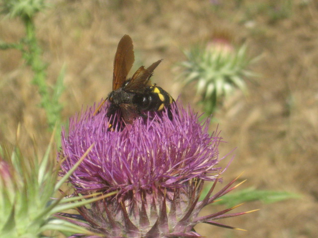 Un' altra scena curiosa: un tentato accoppiamento fra un maschio di Megascolia bidens (Linnaeus, 1767) - Scoliidae e una femmina di Megascolia maculata flavifrons (Fabricius, 1775) - Scoliidae: lei, intenta a nutrirsi, non ne ha voluto sapere e ha subito cacciato il maschio importunante.
