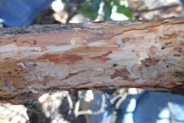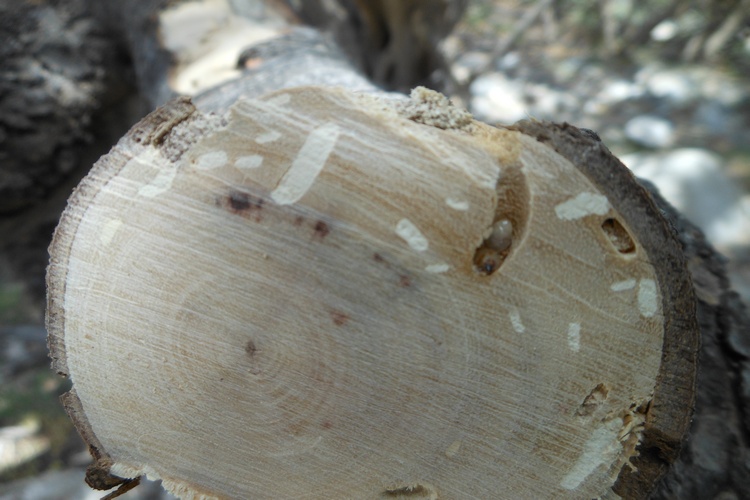 Purtroppo i pini godono tutti di ottima salute e non rinveniamo attacchi larvali sui rami morti, in realtà trovo poco materiale da ispezionare perchè il caldo è torrido e la poca legna morta è molto secca e decorticata...fortunatamente ci rifacciamo trovando un grosso carrubo deperente nei cui grossi rami morti è facile avvistare molti attacchi larvali: