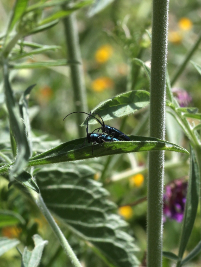 Tra le dune, molto frequenti le piante di asfodelo: qualche esemplare di Agapanthia credo asphodeli; questa mi pare che stia deponendo.