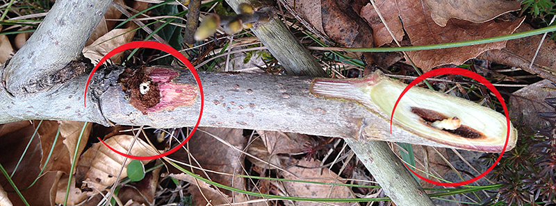 In queste due immagini si vede un rametto di ca. 3 cm di diametro fotografato da davanti e di dietro. Non dimostra evidente ingrossamento, ma una altra caratteristica sempre presente. Sono quelle piccole crepe trasversali della corteccia e quel alone, che con parole poco tecniche ma esplicative chiamo il "livido". Infatti la porzione di corteccia fine che copre la zona di attività della larva sottostante assume un mutamento del colore grigiastro della corteccia sana e diventa leggermente bluastra-violacea, ben delineata da una sottile linea grigio-giallognola e di forma più o meno ovale. Appunto come un livido. Questi due sintomi insieme assicurano la presenza della larva. Non è facile trovarli ma una volta visto uno e compreso il complesso, si individuano da lontano.