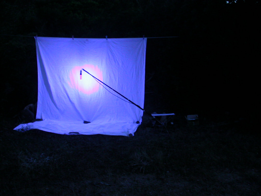 Verso le 21 abbiamo montato telo e lampada nera, attraverso il solito sistema inverter/batterie 12V. Le batterie che mi porto dietro sono sempre due, sia per prolungare la durata della luce, sia per prevenire eventuali imprevisti con una delle due: