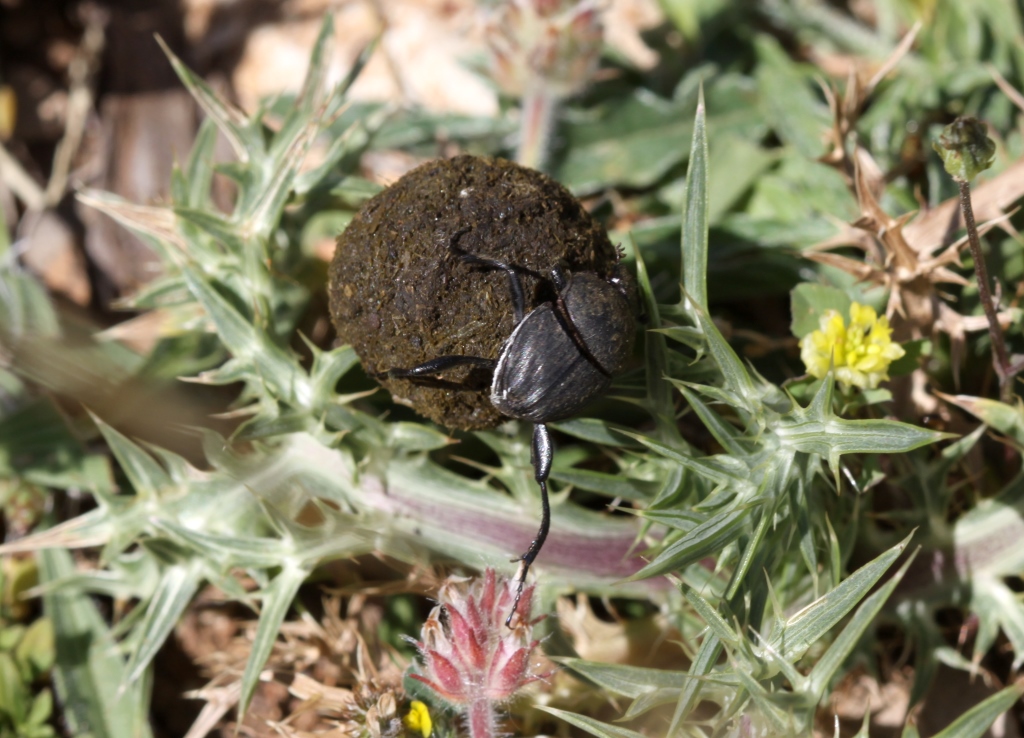 Una coppia di Sisyphus che collaboravano allo spostamento della loro pallina. In altre occasioni mi era capitato di osservarli all'opera su terreni relativamente più "facili", come distese di sabbia o tratti di suolo con poca vegetazione. Qui erano piuttosto in difficoltà, visto che il substrato pieno di piante spinose bloccava in continuazione l'avanzamento del loro tesoro.