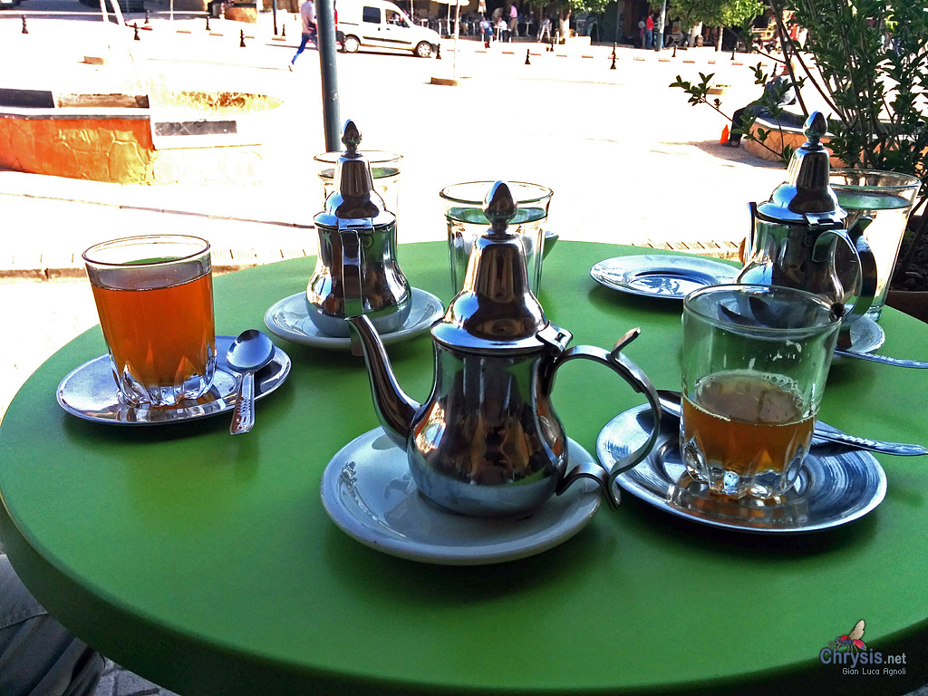 Dopo le fatiche del primo giorno, ci concediamo una sosta in un bar. Cosa prendiamo? Acqua? Una sambuca? Mhm... Ma no! Come avevo fatto a dimenticarlo!?! Un thé à la menthe!!!