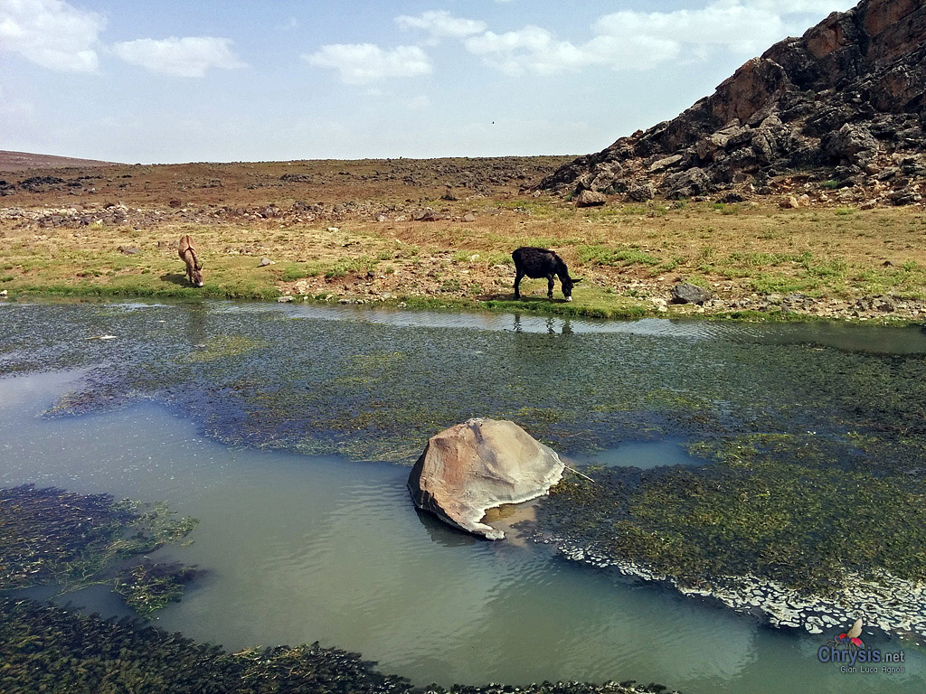 E arriviamo ad Aguelmame Sidi Ali, un bacino vulcanico enorme, con lago, zone di acquitrino e piane prive d'acqua frequentate da greggi di pecore e branchi di asini e cani
