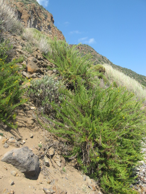 Mi lascio dietro l'abitato di San Pietro e gli errori ortografici degli operai dell'Azienda Regionale Foreste Demaniali, che ha in gestione la Riserva, e comincio l'ascesa a Pizzo Corvo. Subito mi appare la rocca di Punta Falcone (182 m s.l.m.) che svetta sopra San Pietro. Il sentiero attraversa una delle zone floristicamente più rilevanti dell'intero Arcipelago Eoliano: una fitta macchia di lentisco, erica, oleastro, corbezzolo, mirto e carrubo, che nelle zone più aperte lasciano spazio all'assenzio, alla ginestra odorosa e ai cisti, nonchè ai fichidindia, estranei alla flora autoctona dell'isola ma ormai perfettamente integrati nel paesaggio così come in Sicilia e nel Meridione d'Italia. Pistacia lentiscus Ceratonia siliquaArtemisia arborescensAcanthus sp. Myrtus communis