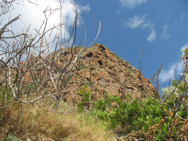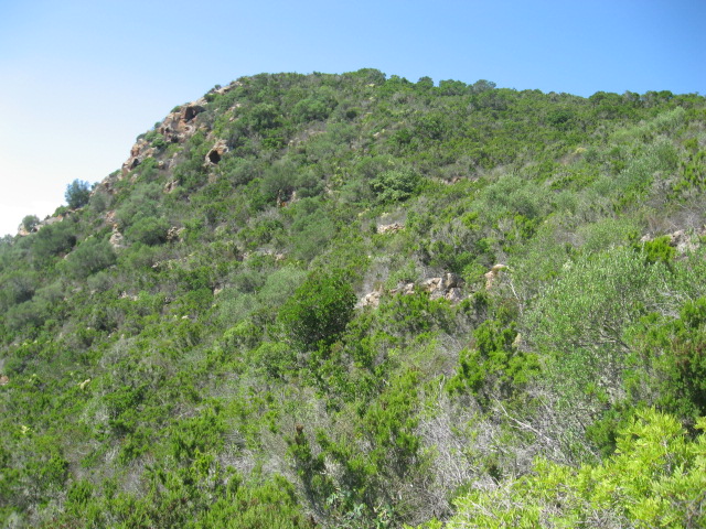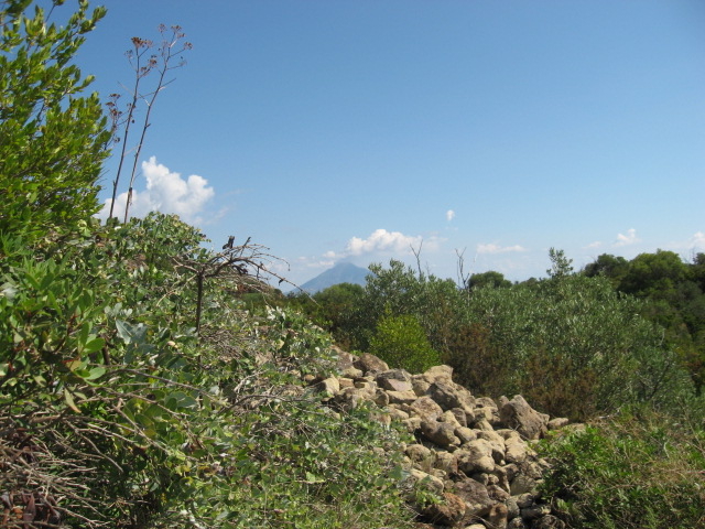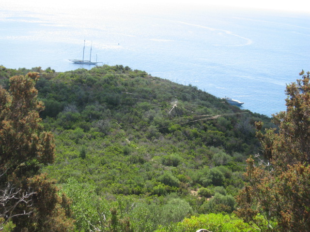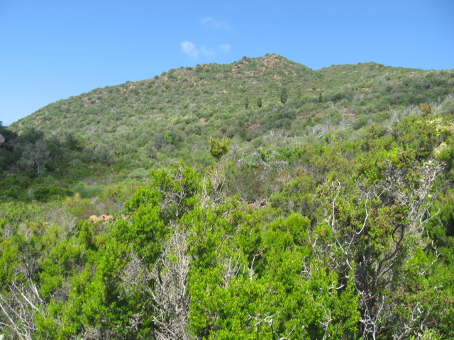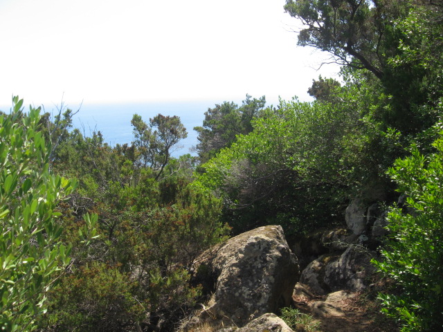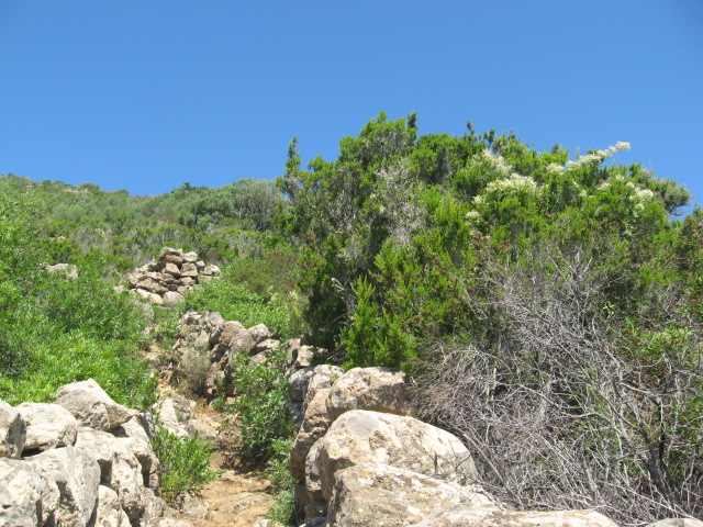 Continuo a salire, e intanto la sagoma di Punta del Corvo già si intravede chiaramente fra la vegetazione, che si dimostra più strutturata in quota con vetusti corbezzoli, ginestre spinose ed eriche.