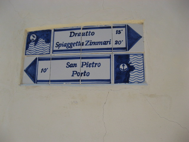 Passeggiando per il caratteristico abitato di San Pietro, il centro più popoloso dell'isola, che complessivamente conta poco più di 200 residenti (la popolazione arriva a decuplicare in estate), mi accorgo con stupore che le vie sono ben curate con numerosi cartelli e ceramiche a mo' di cartello indicanti le principali località dell'isola.