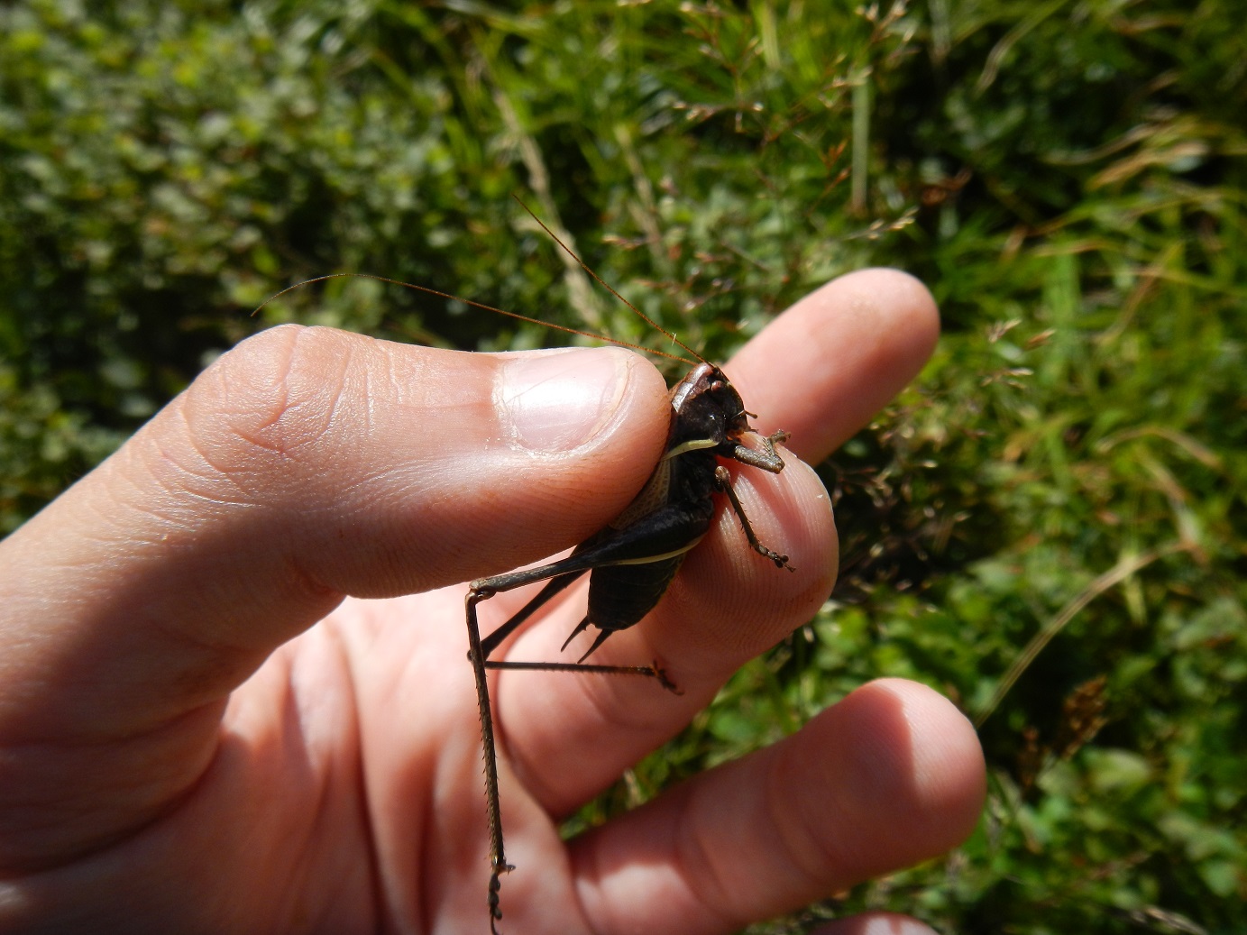 Ieri sono stato una mezza giornata su una delle vette più alte dell'Appennino settentrionale: il Corno alle Scale. Da tempo desideravo visitare i prati cacuminali, che purtroppo mancano quasi totalmente nella mia Romagna (giusto sulla vetta del Monte Falco), ma che in Emilia non sono così rari. Infatti un sistema prativo si estende per circa 15 chilometri dal Monte Cimone (vetta più alta dell'Appennino settentrionale) al Monte Gennaio (sporgenza che si sviluppa dalle propaggini orientali del Corno alle Scale). Questi ambienti, del tutto somiglianti a quelli che si osservano sulle Alpi a circa 2000 metri ma che qui compaiono dai 1500 metri circa, sono estremamente ricchi di elementi boreo-orofili e boreo-alpini, talvolta endemici. In un recente lavoro di Pedroni et Buzzetti (2013) viene addirittura segnalata Bohemanella frigida frigida, che ha qui l'unica sua stazione appenninica . I miei obbiettivi per la giornata erano Podisma emiliae, Metrioptera caprai galvagnii (due endemismi dell'Appennino tosco-emiliano), Pholidoptera aptera goidanichi (endemismo dell'Appennino settentrionale e centrale), oltre a varie specie più comuni e diffuse (come Decticus verrucivorus verrucivorus) che tuttavia mancavano nella mia collezione per mancanza di indagini negli ambienti adatti. Verso le 11:30 arriviamo al Rifugio Cavone, dove facciamo un giro attorno al lago e beviamo la fresca e pulita acqua di montagna da una fontana Ci mettiamo in cammino. Saliamo sul Corno alle Scale da nord intenti a raggiungere la dorsale ed il Lago Scaffaiolo. Lungo il sentiero faccio i primi incontri degni di nota: diversi Decticus verrucivorus verrucivorus saltano tra l'erba alta e qualche Podisma emiliae mi attraversa il sentiero Salendo di quota, ecco il vero e proprio ambiente cacuminale, con i suoi immensi prati e le rocce affioranti. Ora inizia la caccia alla rara Metrioptera caprai galvagnii. Dalle letterature avevo appreso che la Metrioptera caprai sembra nutrirsi di Poacee. In particolare M. caprai galvagnii è legata a Brachypodium pinnatum, una specie orofila e poco comune. A contrario M. caprai caprai si nutre di Festuca. Così mi metto alla ricerca della pianta nutrice, che in realtà appariva piuttosto abbondante in mezzo ai mirtilli. Dopo qualche minuto vedo qualcosa saltare. Che sia la Metrioptera? Non faccio in tempo a mettere a fuoco che schizza via sotto il tappeto di mirtilli ![]() Finalmente riesco a vederla in mezzo alla vegetazione. E' proprio lei! Raggiungiamo il rifugio Le Malghe dove, dopo un gustoso panino, ricomincio la caccia inerpicandomi lungo una altura vicina. Ad un certo punto sento il canto di alcuni maschi di Metrioptera, che seguo fino ad una piccola valle di un ruscelletto. Finalmente riesco a catturarne una bella serietta ![]() Femmina. Maschio. Interessante grotta sotterranea formata dal ruscelletto. In mezzo ai cespugli di mirtillo e di ginepro vedo e sento qualche grosso Ensifero. Finalmente riesco a catturarne uno e, con grande sorpresa, si tratta di Pholidoptera aptera goidanichi femmina! Acchiappo anche un maschio, che schizza via appena tento di inserirlo nel contenitore Continuo a girare per la ripida parete rocciosa, a tratti franosa. Ad un certo punto sento un canto inconfondibile, ma che sul momento non riesco ad associare a nessuna specie presente in zona. Mi avvicino sempre di più, e nel frattempo dico tra me e me: sarà davvero un Polysarcus? Sì! Ecco lì che zampetta, ed al contempo canticchia nonostante sia a pochi centimetri da lui. E' il più grande Phaneropteridae italiano e l'unico Ortottero italiano a cantare mentre si sposta. La cosa più interessante è che non compare nella lista di Pedroni & Buzzetti (2013).Una volta imparato il canto, ne raccolgo ben 6 esemplari. Poi, nonostante ce ne fossero ancora, ho smesso perché il sali e scendi, sempre in bilico su quei ciottoli, stava diventando stancante. Ecco qualche foto agli esemplari avvistati. Da notare le tegmine ancora in posizione di canto in questo esemplare. Ogni tanto si vedevano altre Podisma emiliae. Eccone due in copula. Ormai ho sviscerato la fauna ortotterologica della zona, ma per ritenermi soddisfatto devo saldare un conto in sospeso con il maschio di Pholidoptera aptera goidanichi. Così, finalmente, riesco a captare i canti dei maschi, tutti concentrati in mezzo ai cespugli di ginepro. Dopo vari tentativi andati a vuoto, ne acchiappo uno. Eccolo in tutta la sua bellezza ![]() Poi si torna a casa, soddisfatti per i regali del Corno alle Scale Ecco le specie raccolte. Podisma emiliae. Chorthippus (Chorthippus) parallelus (preso giusto per la località). Alcuni Decticus verrucivorus verrucivorus e una Tettigonia cantans (presa per la località). Pholidoptera aptera goidanichi .Una bella serietta di Metrioptera caprai galvagnii ![]() Polysarcus denticauda. Vi saluto con la speranza che qualcuno si sia interessato agli Ortotteri anche per pochi minuti leggendo queste righe.