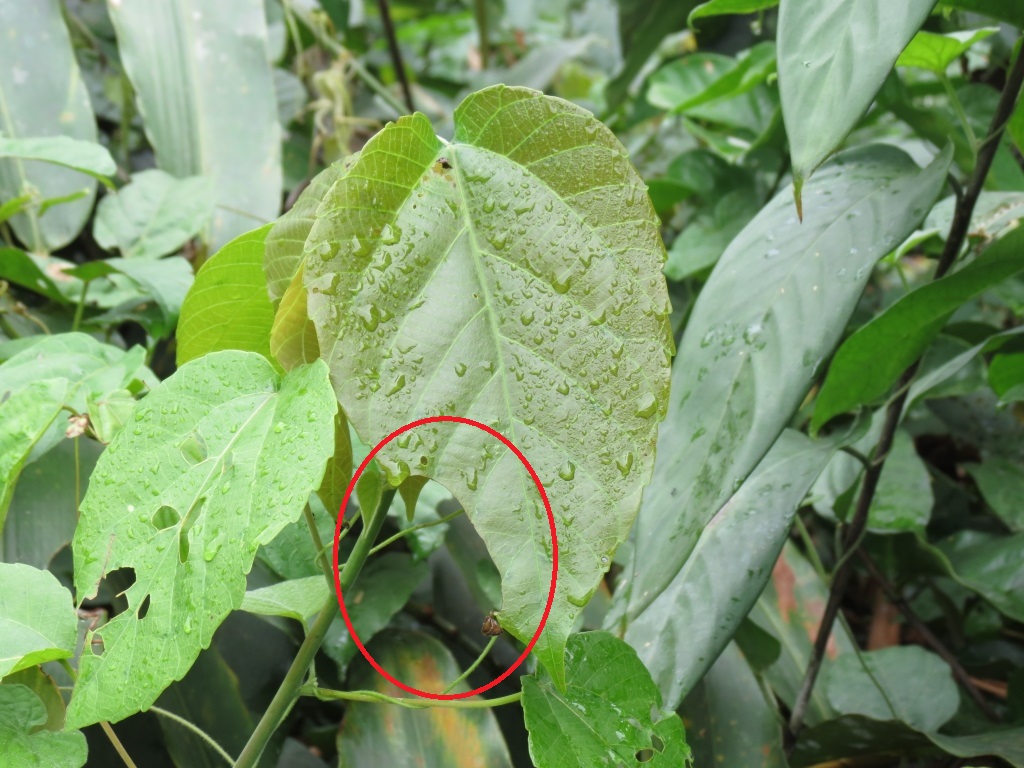 Ed ecco il primo caso, fotografato a pochi metri dalla mia abitazione gabonese: Dalla prima immagine è evidente il modello di taglio (figura k della tabella di Sawada), caratteristico delle specie di Attelabidae appartenenti al genere Euops. Nell'immagine in dettaglio è evidenziato il piccolo sigaro: dimensioni ridotte, dato che le specie in questione sono decisamente piccole (almeno quelle africane). Ho provato a conservare il sigaro, nella speranza di ottenere l'adulto, ma la cosa non è riuscita. Per concludere questa parte, due note: durante la spedizione, nonostante li abbia cercati con ostinazione, non ho raccolto nessun esemplare di Euops; dalle poche notizie che si hanno, le specie africane di questo genere sono tutt'altro che frequenti.