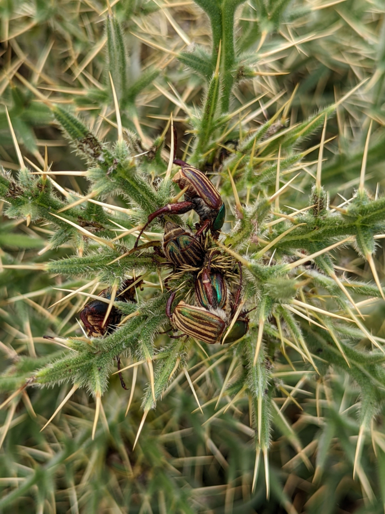 Il terzo e il quarto giorno esploriamo i dintorni: Ras Elma, le foreste di cedri e le praterie sopra Azrou. Per prima cosa ci fermiamo a raccogliere un po’ di legna nella foresta di cedri sopra Ifrane, dove ogni tanto fa capolino un branco di scimmie. In quest’ambiente, a parte la legna, troviamo davvero poco. Ci spostiamo quindi nelle praterie di Ras Elma, dove le praterie di montagna si alternano alle foreste di cedri, che sembrano un luogo fatato per la calma che vi regna e la luce che filtra tra gli aghi. Qui troviamo diversi floricoli, Carabidae e Perotis unicolor su alcune piante erbacee basse, molto diverse dalla radica arborea su cui si trovano qui in Francia. Troviamo anche un Carabidae molto particolare, che sembra un’Anthia in miniatura: un Graphipterus sp., di cui ho solo questa brutta foto (correvano come matti!). Sconcertante è la mancanza di farfalle: solo poche banalità sulle poche oasi fiorite che sono scampate all’ovinica devastazione. Ci spostiamo quindi verso Azrou, per esplorare le praterie di alta quota, dove però non troviamo quasi niente, nemmeno la nostra preda “target”, l’ Iberodorcadion atlantis. All’inizio della strada che porta verso le montagne però, troviamo un’oasi felice deovinizzata, dove facciamo delle ottime raccolte, sui fiori e sfalciando, trovando almeno 10 specie di Meloidae, due specie di Agapanthia (irrorata e annularis), Blepisanis melanocephala, Oedemera barbara e Oedemera simplex, Glaphyrus opulentus mesatlanticus, Eulasia bobylius, Aethiessa floralis, tre specie di Trichodes e molte altre. Inserisco alcune foto, per dare un’idea della diversità. In più, sui cespugli di astragalo, trovo una bella serie di Julodis pilosaUna Mylabris Questo mi ricorda un Lydus Un altro Meloidae Maschio e femmina di Cerocoma sp. Un Clytrino non meglio identificato Eulasia bombyliusGlaphyrus opulentus mesatlanticusLarinus onopordi, se non sbaglio di grosso Trichodes flavocinctus, mi pare Oedemera simplexLa Julodis pilosa