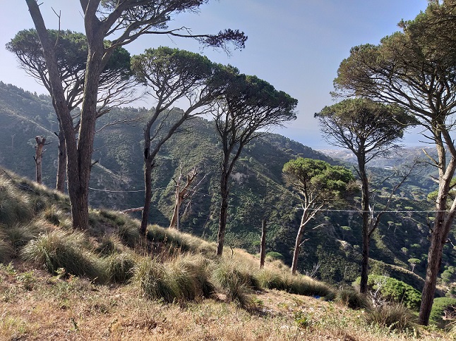 Dopodiché si incontra un vallone in cui è riuscito a scampare agli incendi un piccolo boschetto di Pinus pinea e Quercus virgiliana. Il sottobosco è dominato da Erica arborea, Pteridium aquilinum e Rubus ulmifolius. Si tratta dell'unica zona ombrosa di tutto il percorso.