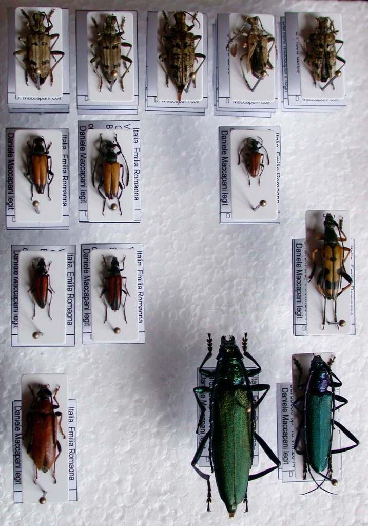 Una foto di gruppo dei cerambicidi: Aromia moschata, coppia raccolta in copula su un cardo (  ), Stictoleptura rubra femmina (l'unica cattura fra i cerambicidi di cui sono stato davvero contento, dato che mi mancava), Stenurella melanura, due femmine, una Rutpela maculata (l'unica abbastanza frequente), una Pseudovadonia livida e due Paracorymbia fulva; i Rhagium inquisitor li ho ottenuti a casa da pupe raccolte sotto corteccia di peccio... Purtroppo si vede che sono un pessimo allevatore: da otto pupe ho ottenuto cinque adulti, di cui due malformati  Ho ancora sei larve, ma non credo ne uscirà qualcosa... Fra i carabidi, mi ha fatto molto piacere raccogliere dei Cychrus, che non avevo mai incontrato prima!  Credo sia la specie più comune, anche per le grandi dimensioni (che non ricordo, ma più o meno vicine ai 3cm), ovvero C. italicus. Quello a sinistra preparato su cartellino l'ho raccolto morto, trovato per puro caso in mezzo alla lettiera di faggio, calpestato da qualcuno da non molto. Un'altro era anch'esso a terra fra la lettiera di faggio e un'altro in un ceppo marcio sempre di faggio. Quando troverò il tempo per le altre foto seguiranno tutti gli altri carabidi, per i quali chiederò il vostro aiuto per la determinazione Per ora è tutto
