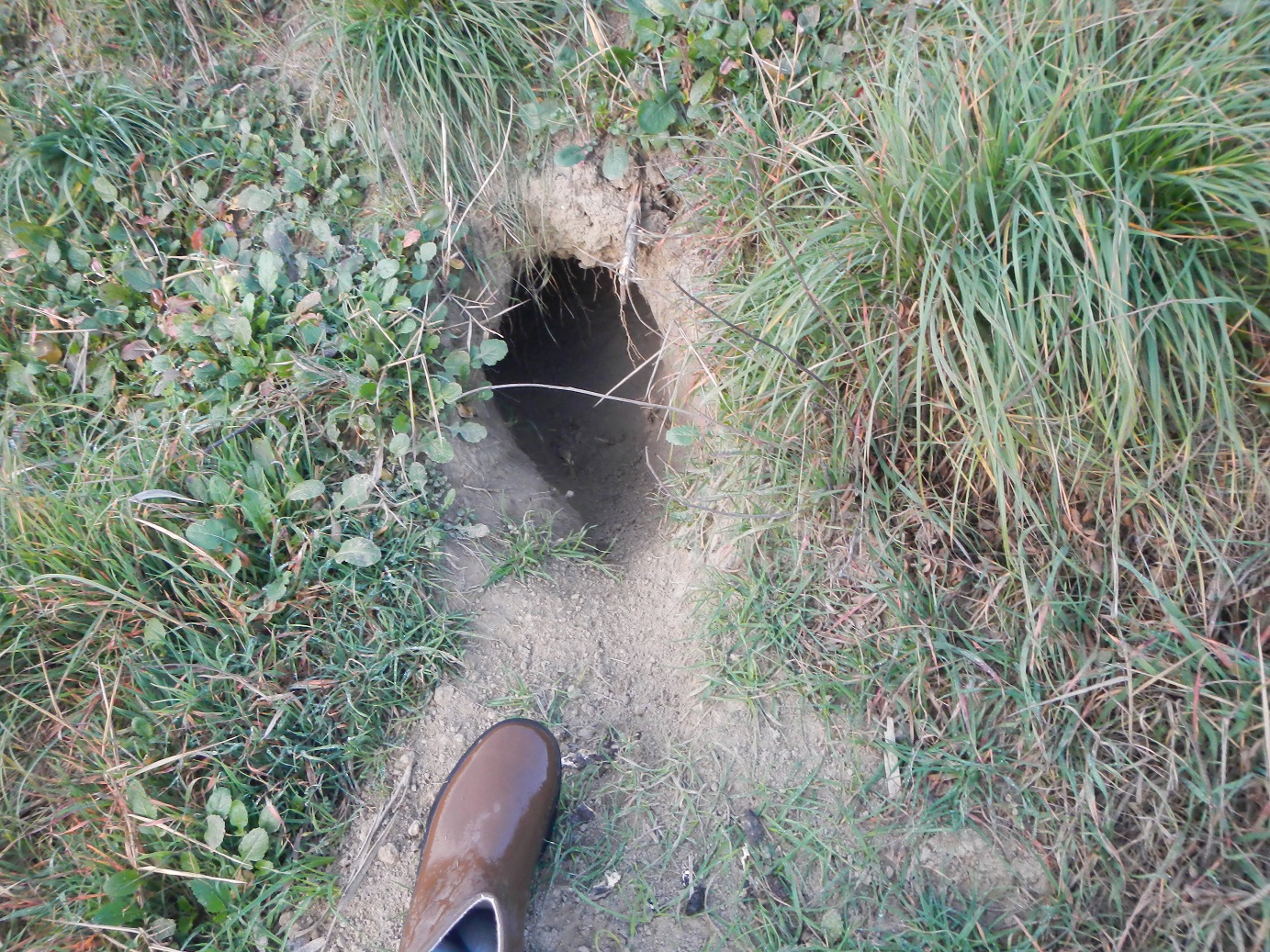 Questa tana era bella grande, non ne vedevo il fondo. All'uscita c'erano feci sdrucciolevoli contenenti resti di insetti coriacei.
