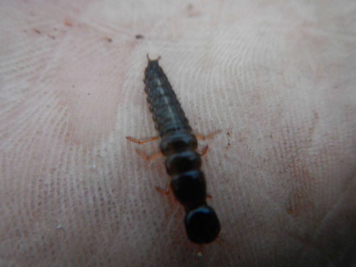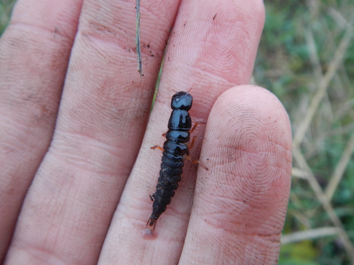 Al ritorno mi metto ad alzare le rosette di foglie della salvia di prato. Sotto ci trovo questa larva di Ocypus lunga sui 25 mm. Penso che sia di Ocypus (Matidus) nitens di cui ho trovato l'adulto nello stesso luogo.