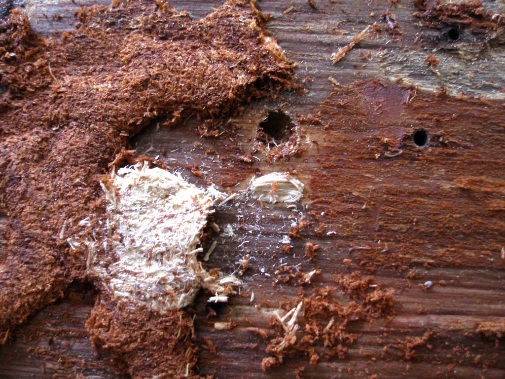 Rhagium inquisitor (Linnaeus, 1758). La stessa fortuna non ha avuto l’abbondante popolazione di questa specie, poiché i numerosi adulti già formati in celletta sono destinati alla distruzione o, nel migliore dei casi, se lo scortecciamento avverrà in foresta, a dover trovare un rifugio in cui trascorrere l’inverno. Può anche succedere (e forse succederà, in qualche caso) che gli adulti (perfettamente maturi anche per la stagione calda protrattasi a lungo) si accoppino e depongano in settembre. In effetti, ho trovato alcuni vaganti adulti sui tronchi, probabilmente scacciati dalle loro cellette a causa dello scortecciamento traumatico per il trascinamento dei tronchi. Ho osservato maschi di piccolissime dimensioni femmine larve in gallerie nutrizionali anche di piccole e piccolissime dimensioni . Era anche presente una femmina perfettamente sana in una celletta invasa da muffa