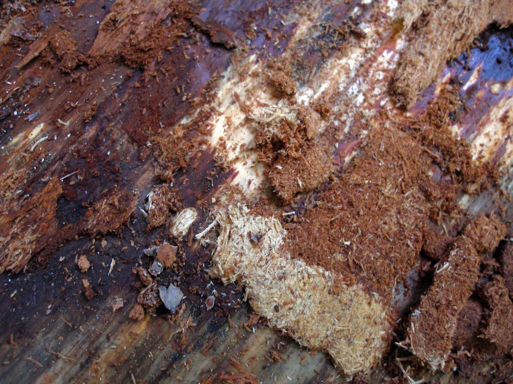 Particolare di un attacco con (da destra a sinistra) galleria larvale con segatura scura (la larva si è nutrita della parte interna della corteccia), galleria chiara (la larva penetra nell'interno), tappo di segatura per la chiusura della celletta), foro di uscita.