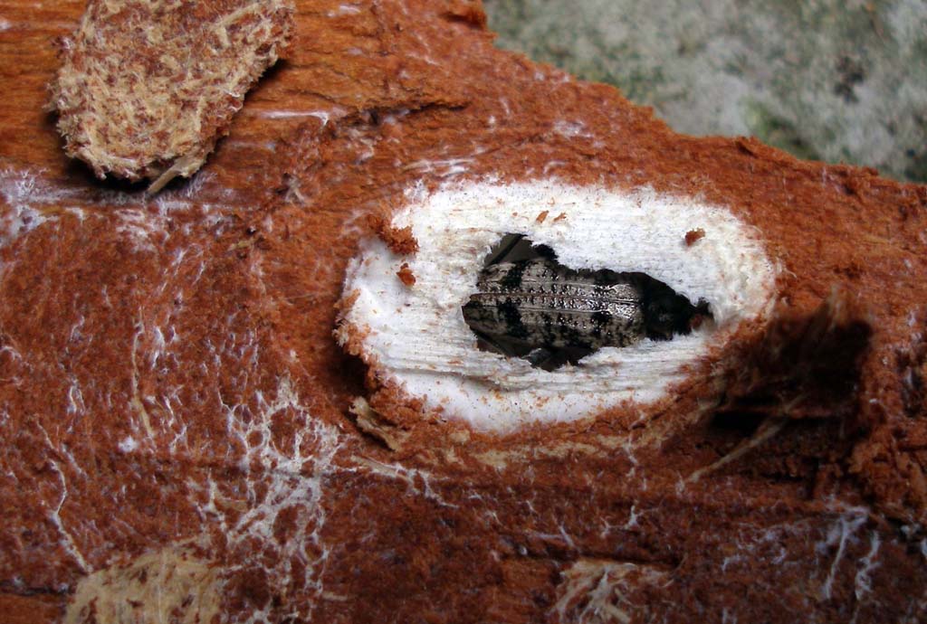 Acanthocinus reticulatus_foro di uscita_larva in celletta_Campigna 13 settembre 2011 057.jpg