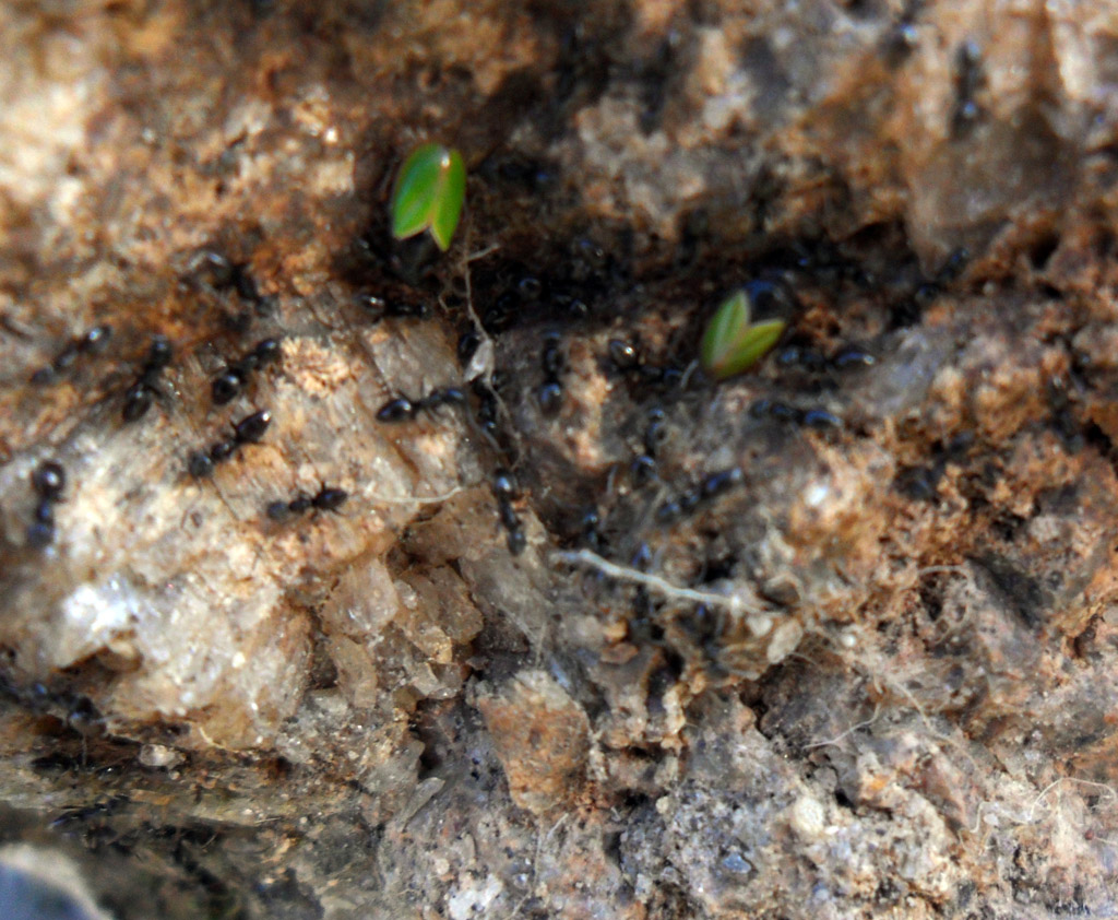 A uno degli spiazzi in pietra ho ribaltato un sasso e sotto ho notato due cose verdi in mezzo a delle formiche, pensando fossero semi stavo per rigirare il sasso quando mi sono accorto che si muovevano. Mi avvicino e noto che sono due piccoli Omotteri, credo Tettigometridi. Ne ho raccolto uno(l'altro è saltato via) e credo di aver raccolto anche due o tre formiche.