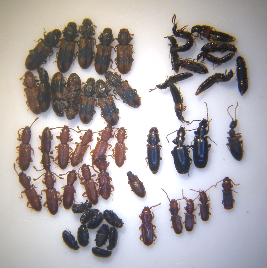 Ho notato che Tenebrionidae, Laemophloeidae, Cucujoidea in genere, Lebia e altri Coleotteri si trovano soprattutto sugli alberi in piedi, sia morti che vivi ma con parti morte o morenti da cui si sta staccando la corteccia. Altri, come gli Histeridae e gli Staphylinidae, li trovo più spesso scortecciando tronchi morti caduti a terra. Non bisogna tralasciare nemmeno piante di piccole dimensioni. Per esempio, a volte basta staccare pezzetti di corteccia di pochi cm da piante col fusto di meno di 10 cm di diametro, per trovarci qualcosa sotto (io purtroppo quando faccio queste ricerche ormai devo farlo con gli occhiali da lettura, altrimenti vedo solo le bestie più grandi).
