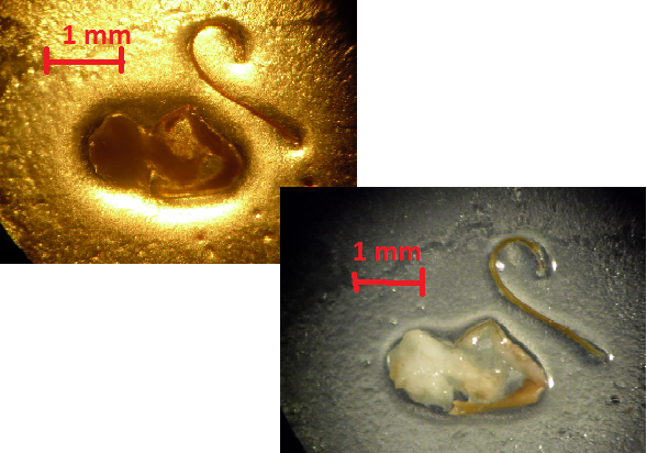 Ho anche un problema nell'estrazione. Non sono sicuro che quello che ho tirato fuori sia l'edeago e non un'altro organo! Inoltre mi sembra un po' piccolo per la lunghezza dell'esemplare:
