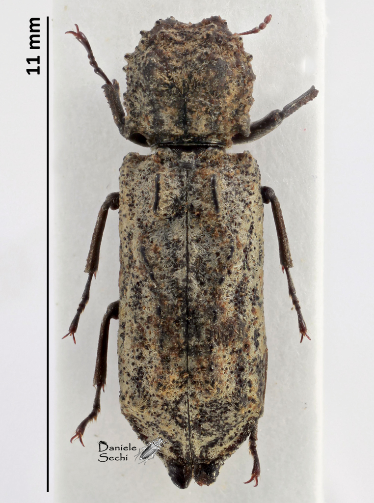 Unico esemplare, raccolto al lume. Con il testo "Les Coléoptères Bostrychides de l'Afrique tropicale française" (Lesne, 1924) arrivo a Lichenophanes caudatus (Lesne, 1895), specie molto caratteristica.