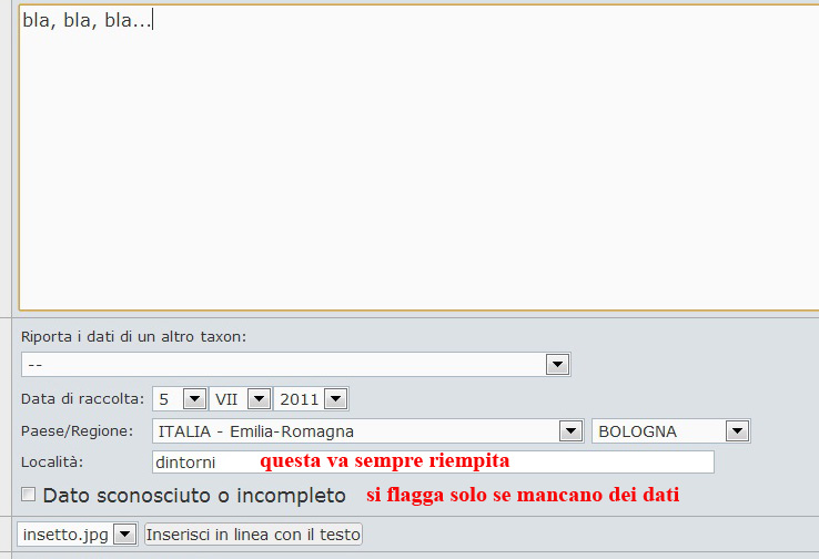 volevo aggiungere che, quando si hanno TUTTI i dati di raccolta o dello scatto, mese, anno, regione, località e provincia è INUTILE flaggare la casella "dato sconosciuto o incompleto", perchè così appare la scritta in rosso.