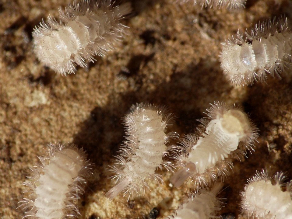 Veramente, l'articolo parla dei Polyxenus sp., che appartengono ad un altra famiglia. A suo tempo avevo provato a chiedere e a cercare se lo stesso valesse anche per i Lophoproctidae, ma non risultava niente, anche se sarebbe logico, perché la forma è molto simile e le abitudini anche. I Polyxenus sono più piccoli e se ne trovano in quantità sotto le cortecce, proprio dove stanno anche le larve di dermestidae (difficile è vederli! ). luigiAllego una foto ingrandita e una venuta male (all'ombra) che però lascia intravedere un collembolo e uno psocottero come confronto. Mediamente, sono lunghi la metà di quelli bianchi, e anche meno. (Foto fatte a Ostia Antica il 21-12-2011)