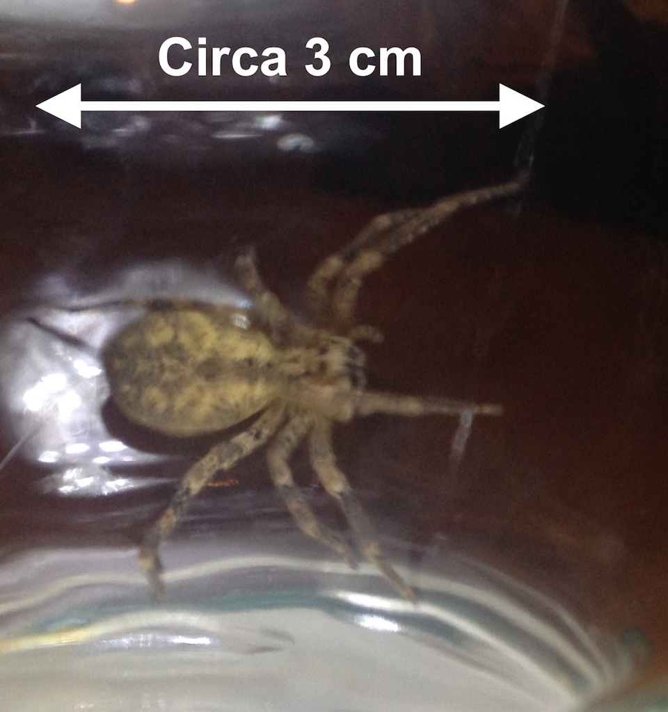 Pochi giorni fa ho trovato un ragno in casa. Abito in provincia di Modena, in pianura. Il ragno in questione ha dimensioni di circa 30 mm (zampe comprese), è stato catturato (sul mio polpaccio!), fotografato e liberato. Sinceramente spero di non rivederlo in casa e gli auguro buona fortuna nel mio giardino. Mi aiutate ad identificarlo? Magari spiegandomi come si fa, se esiste un metodo o se ci si basa soltanto sulla memoria e sull'esperienza.