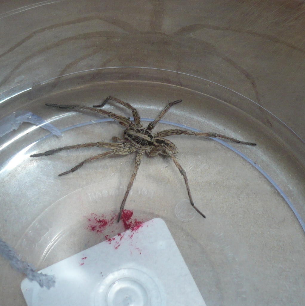 Illuminami su un punto. Ma tu stai a porte aperte la sera? Perche veramente è molto strano che la stessa Hogna radiata femmina entri ed esca da casa. Molto strano. Prendi un mestolo di legno e da lontano tocca il pavimento vicino al suo addome, lei correrà in avanti portandosi in un'altra posizione. Continua cosi fino a che la posizione non sarà giusta. E da li, bicchiere sopra e foglio di carta a separarla dal pavimento.