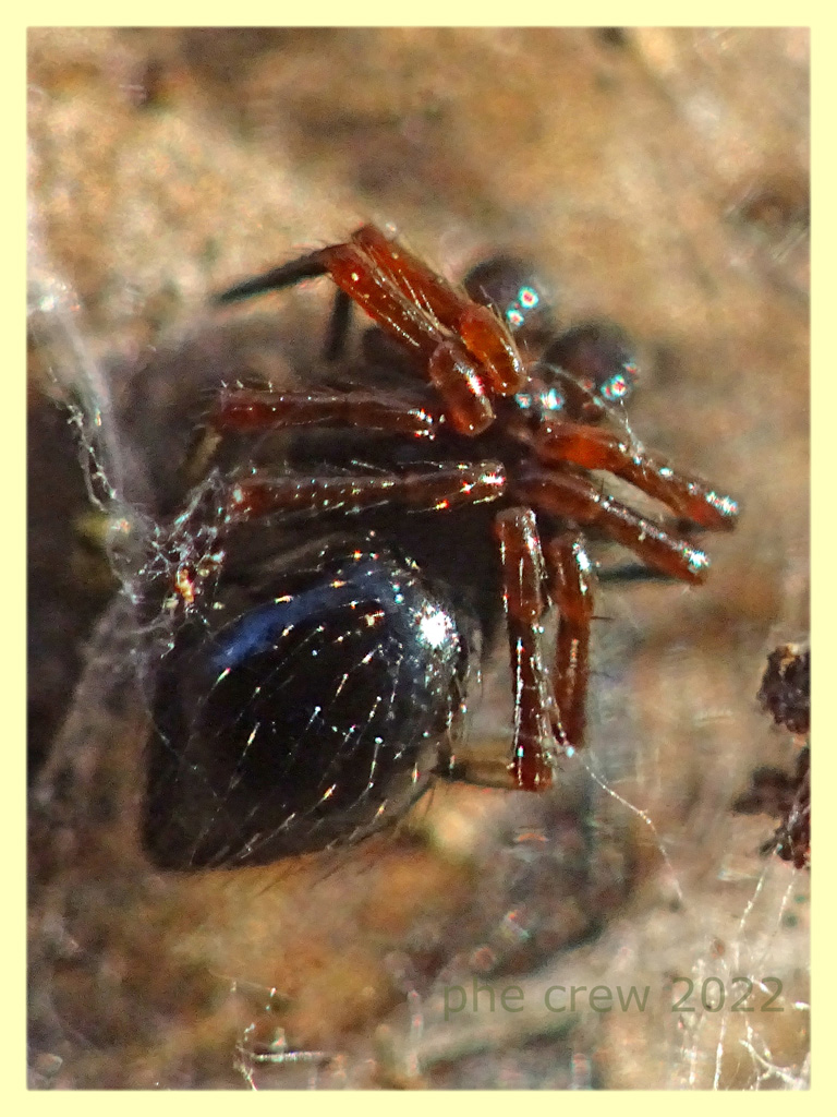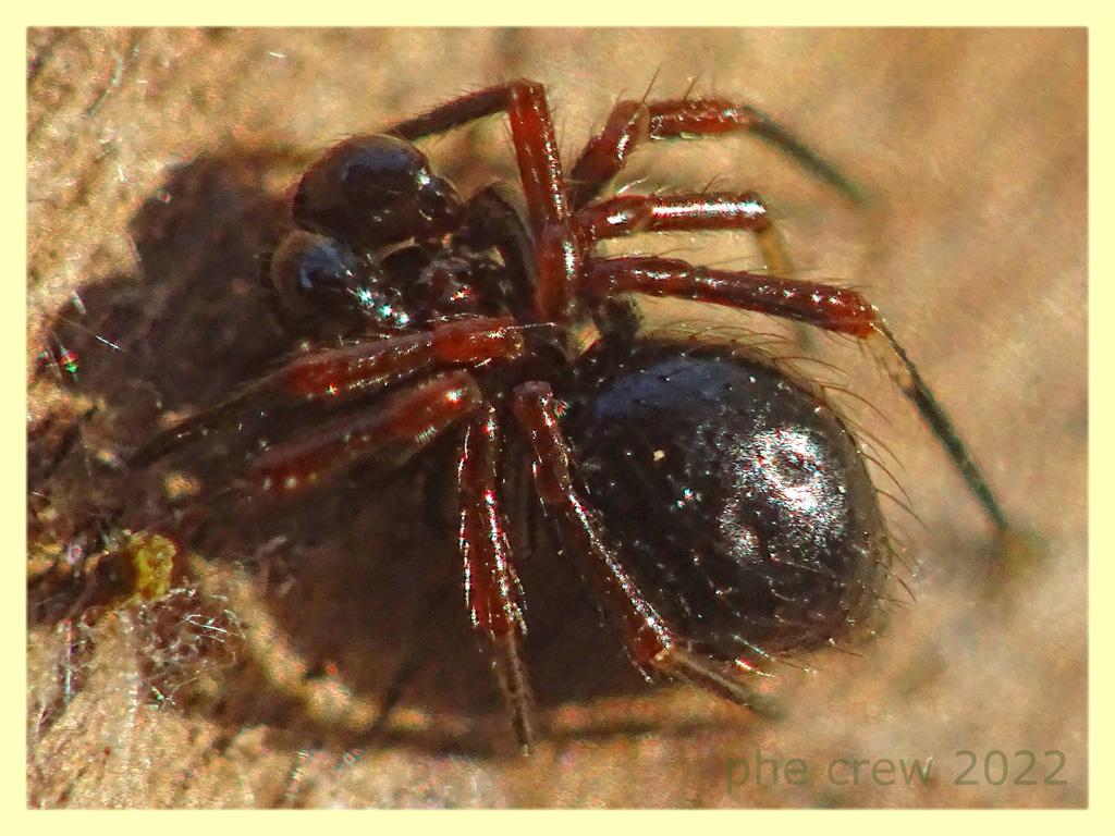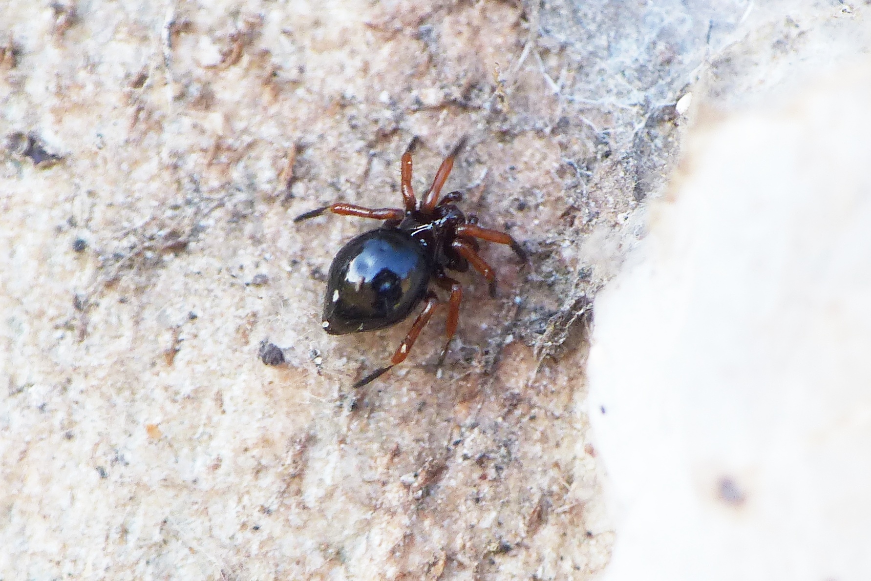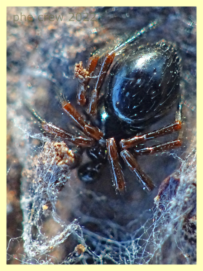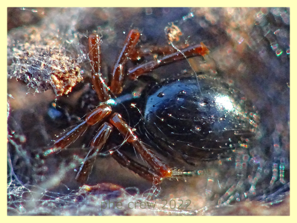 Un ragnetto lucido ancora più piccolo, che si trova anche lui in colonie sotto le cortecce degli eucalipti in questa stagione, è Silhouettella loricatula, che è uno dei pochi ragni con l'opistosoma rivestito da un guscio rigido aperto come un mantice. Si tratta di colonie attive e non di individui in letargo. Si nutre di collemboli e psocotteri.
