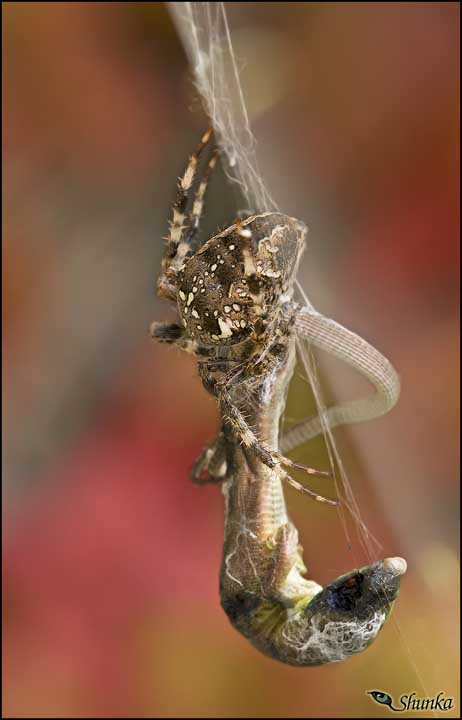 Non è poi una cosa cosi impressionante. Certo, è molto inconsueta, difficile da osservare magari, ma non cosi strana. Infatti la tela degli Araneidae, oltre a poter essere molto vasta, è anche abbastanza resistente. Almeno da sostenere piccoli sforzi (non hai indicato le dimensioni, ma son certo che il ramarro era molto giovane) L'intrappolamento di piccoli rettili quindi, come in questo caso, avviene in maniera del tutto involontaria. Una volta che il rettile, cadendo da rami superiori, rimane intrecciato nella tela e non riesce quasi piu a muoversi, diviene agli occhi del ragno una preda come un'altra. Se non ci fosse però questa casualità, cioè se il rettile riuscisse a dimenarsi tanto da liberarsi, o arrivasse a portata del predatore senza essere incastrato, beh, il nostro Araneidae farebbe certamente dietrofront. Mi è capitato di vedere alcune volte, dal vivo e sui forum tematici, situazioni inconsuete come questa. Situazioni comunque del tutto indipendenti dalla voracità o aggressività del ragno.