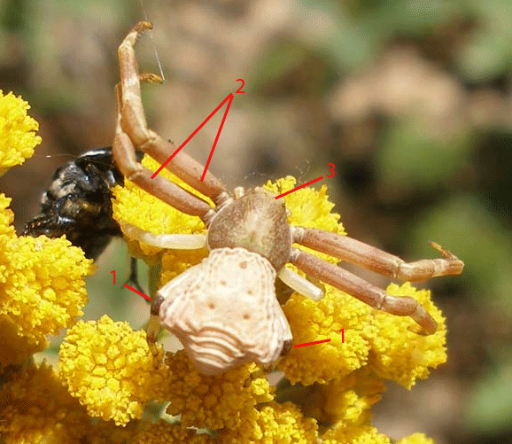 2) I e II paio di zampe sono molto più lunghe del III e IV paio ma anche più robuste/ispessite, in Thomisus sp. sono sì lunghe ma decisamente meno robuste/spesse.
