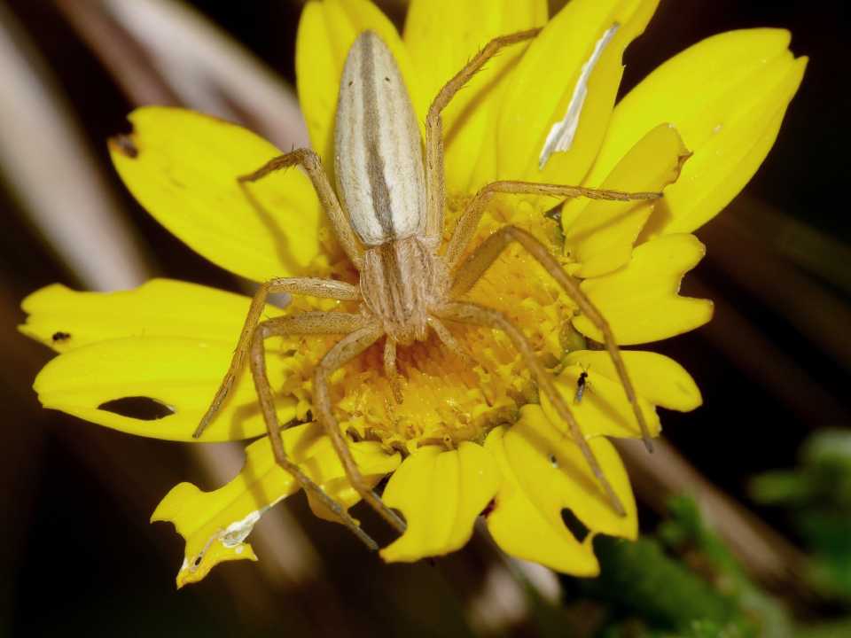 Micrommata sp. (Sparassidae) ed in particolare Micrommata cf. ligurina. Semmai poteva essere confondibile con un Tibellus sp., ma quest'ultimo si può tranquillamente escludere in quanto ha occhi mediani posteriori più piccoli rispetto al gruppo Micrommata. Una Pisaura sp. in genere la riconosci a occhio nudo perchè la banda mediana colorata che attraversa il prosoma finisce in mezzo agli occhi mediani posteriori, contrariamente a quanto accade in Micrommata sp. dove la suddetta banda si divarica e include al suo interno gli occhi mediani posteriori. |