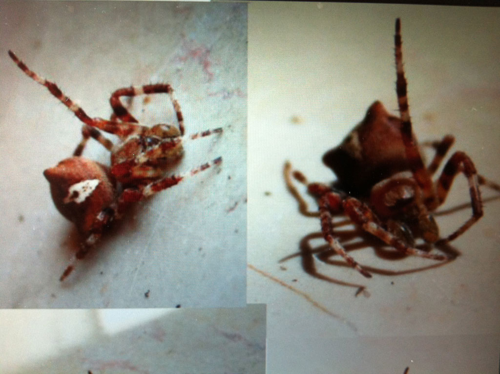 In realtà sono diverse le specie di Araneus ad avere protuberanze anteriori sull'addome e marchi cosi evidenti. L'esemplare immortalato è un maschio subadulto, probabilmente di Araneus angulatus Clerck, 1757. Dico probabilmente perche ci sono alcune specie (A.circe, A.saevus...) che sono molto molto simili e distinguibili solo dai genitali. Inoltre la livrea di questi animali, di tutto il genere, è molto variabile e non è quindi utile a fare chiarezza. Io, pur credendo che trattasi di A.angulatus, indicherei Araneus cf. angulatus Clerck, 1757 - Araneae, Araneidae