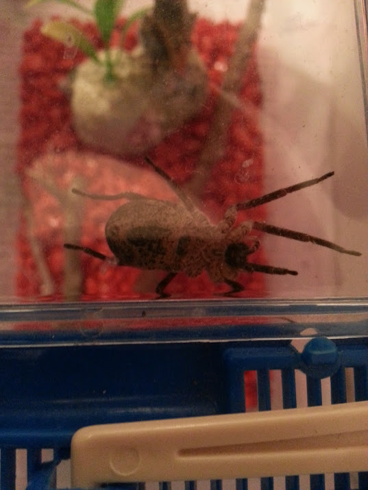 E' un ragno facilissimo da allevare e dà soddisfazioni. Non cattura le prede con la ragnatela, ma solo con la forza fisica e la tattica. La tua sembra ben nutrita e non avrebbe bisogno di mangiare oltre, ma non dice mai di no :p .