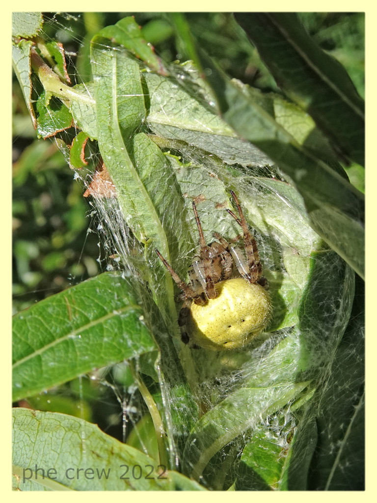 ….questo dovrebbe essere un Araneus quadratus….fotografato su di una pianta sulle rive di un torrente. ...e questa e' la tana dove era nascosto, in ordine di apparizione vista da sopra e da sotto. |